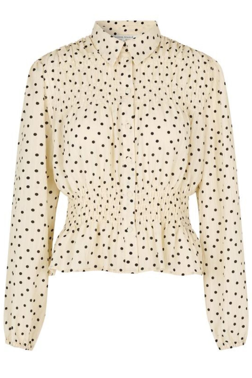Chemise de Second Female dans une nuance beige clair avec des pois noirs. La chemise a un col de chemise, des boutons à l'avant et des manches longues avec des détails en volants.