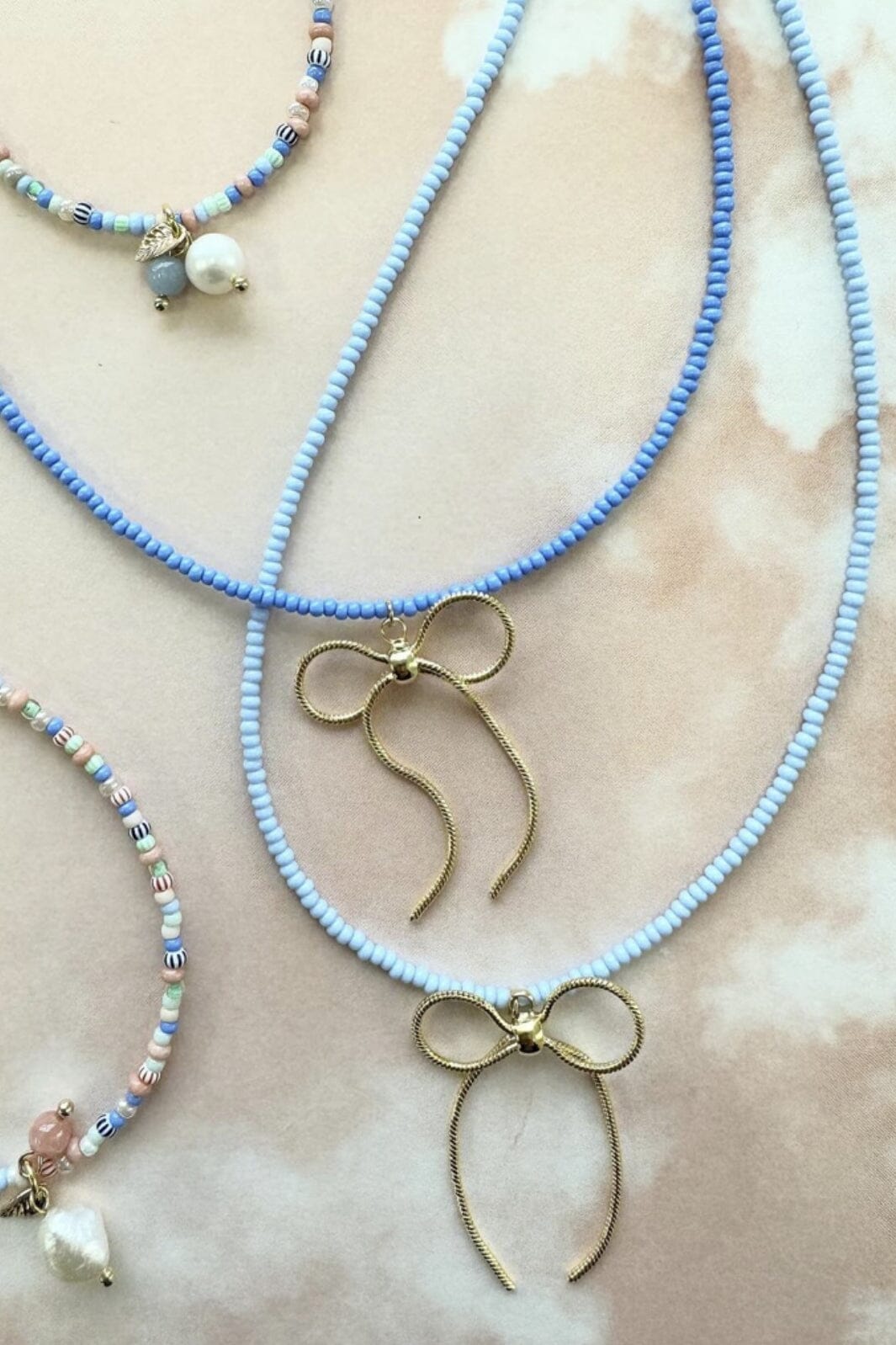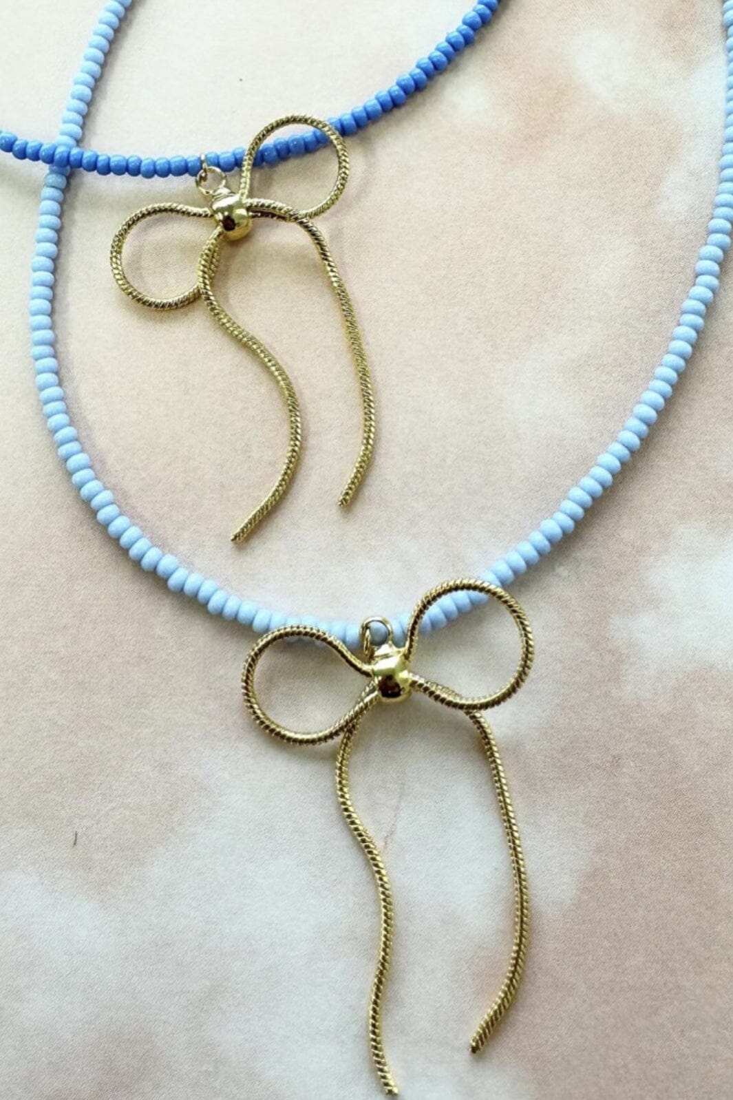 Un collier avec un pendentif en forme de nœud en métal doré. Les perles bleu clair entourent toute la chaîne et créent un joli contraste.