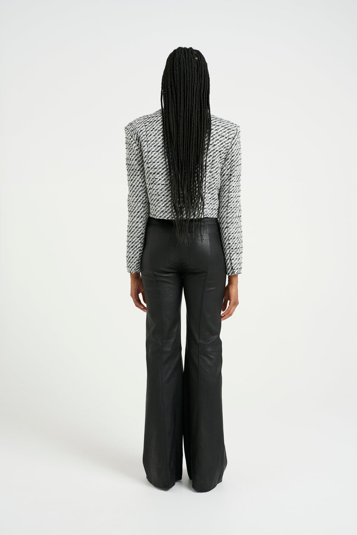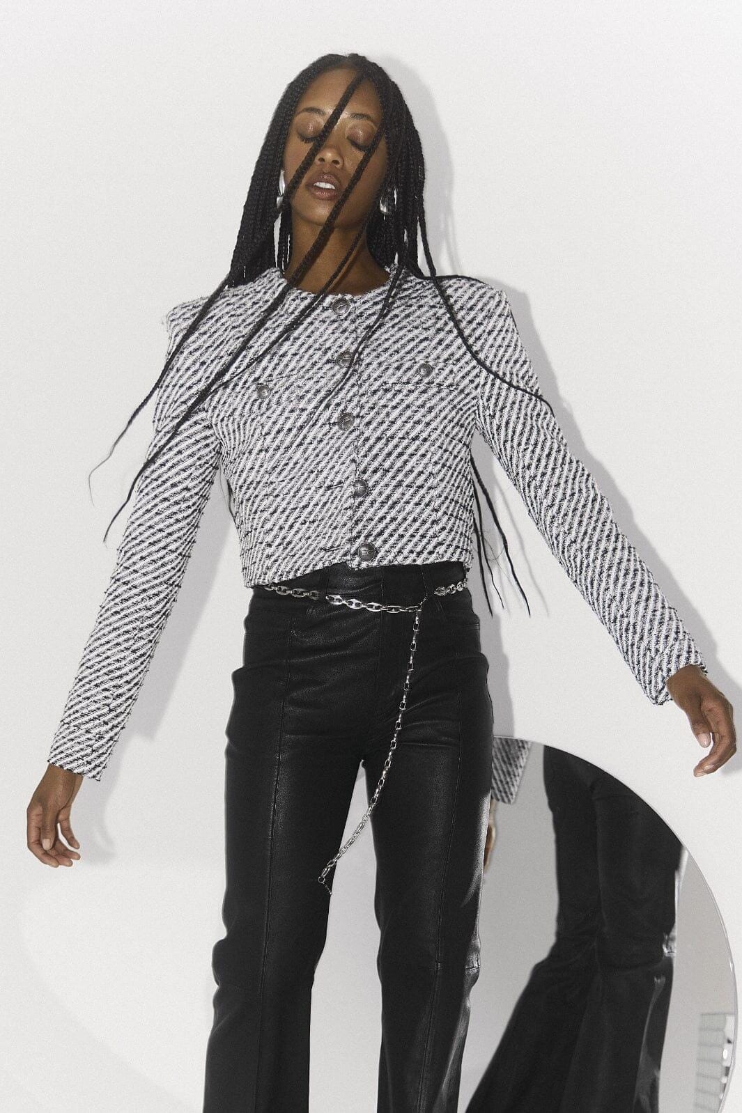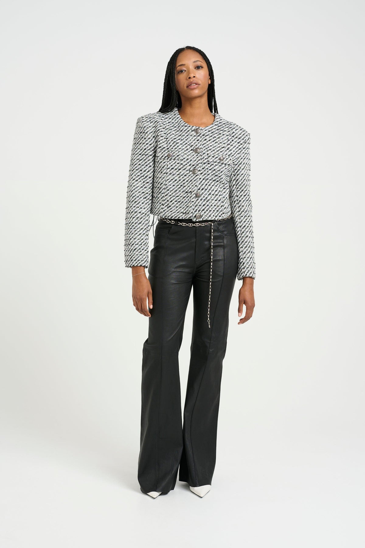 Veste cropped noir et blanc de Gestuz avec épaules structurées et rayures en lurex twill. La veste a une longueur courte et des boutons à l'avant.