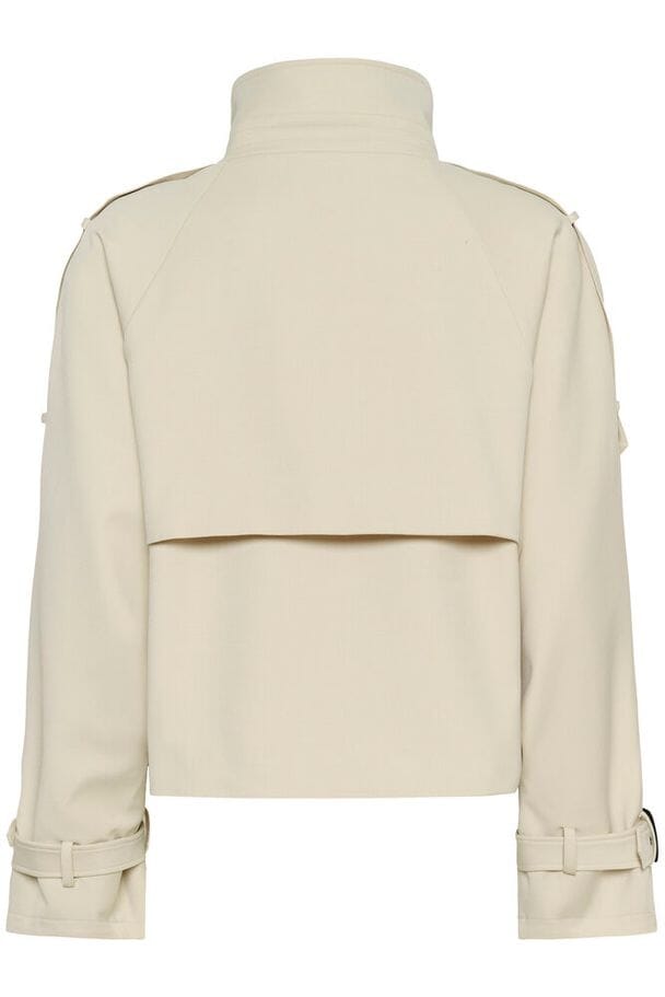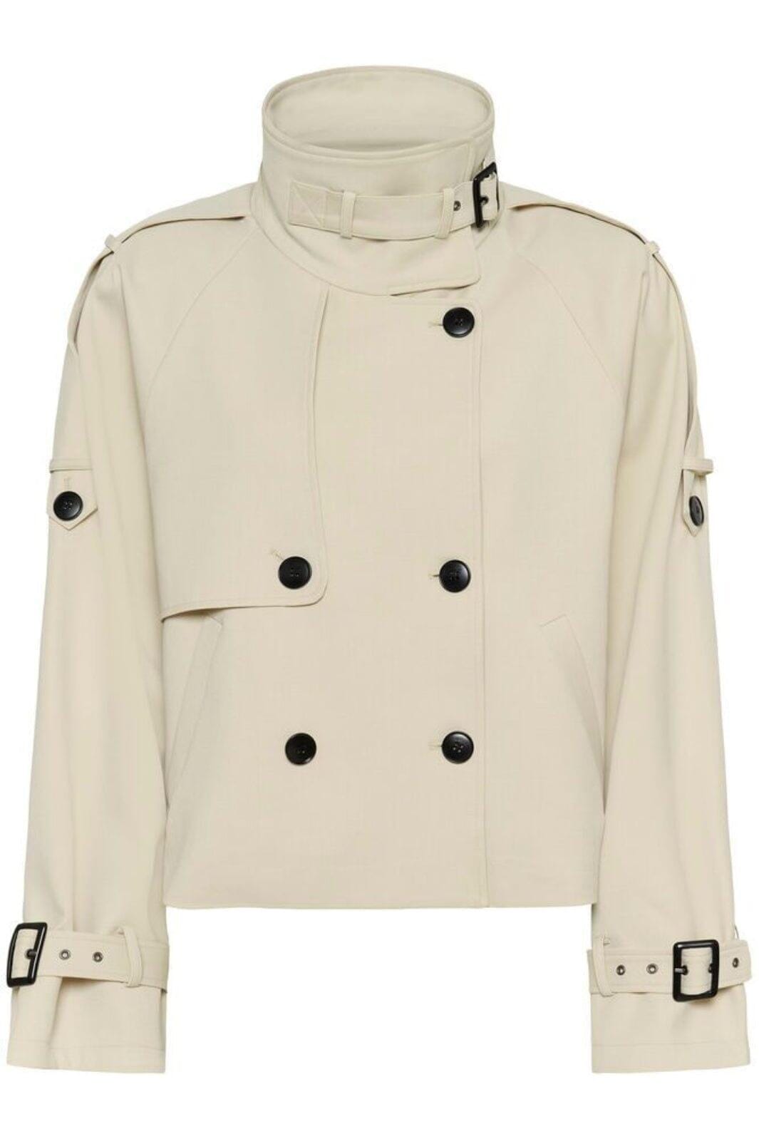 Trench-coat court Gestuz de couleur beige. La veste présente une coupe croisée à double boutonnage avec de gros boutons noirs et des détails de boucles au col et aux manches.