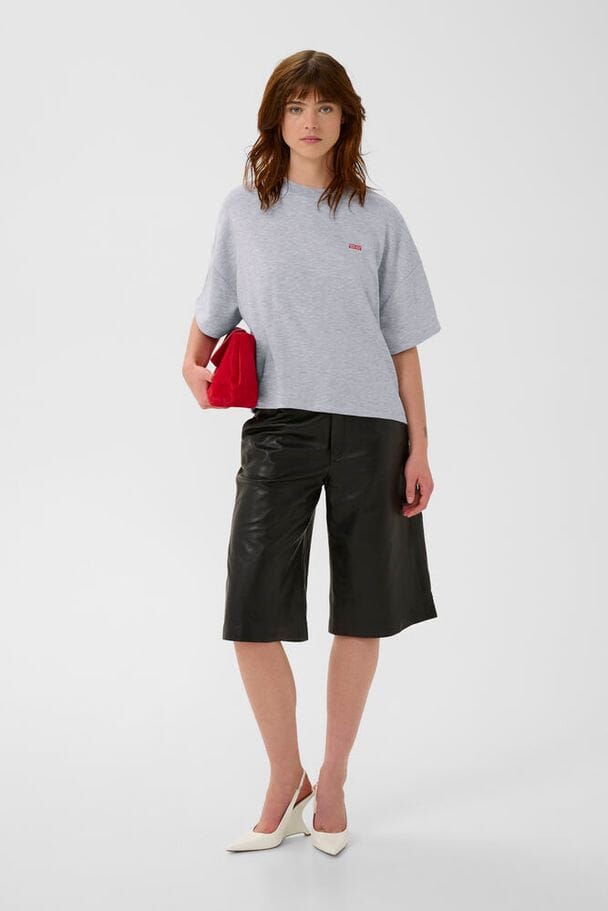 T-shirt sweat gris chiné de Gestuz dans une nuance gris ultra clair chiné. Il présente une coupe oversize et des manches courtes avec un petit logo rouge sur la poitrine.