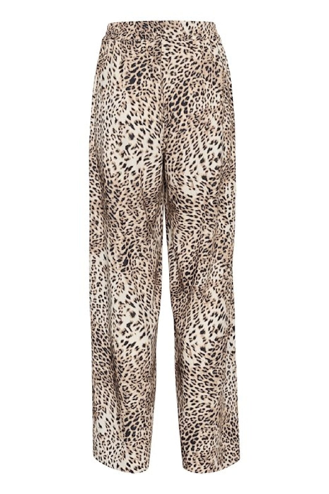 Pantalons longs de Gestuz dans un motif léopard clair. Les pantalons ont une coupe droite et une taille élastique qui offre une bonne liberté de mouvement.