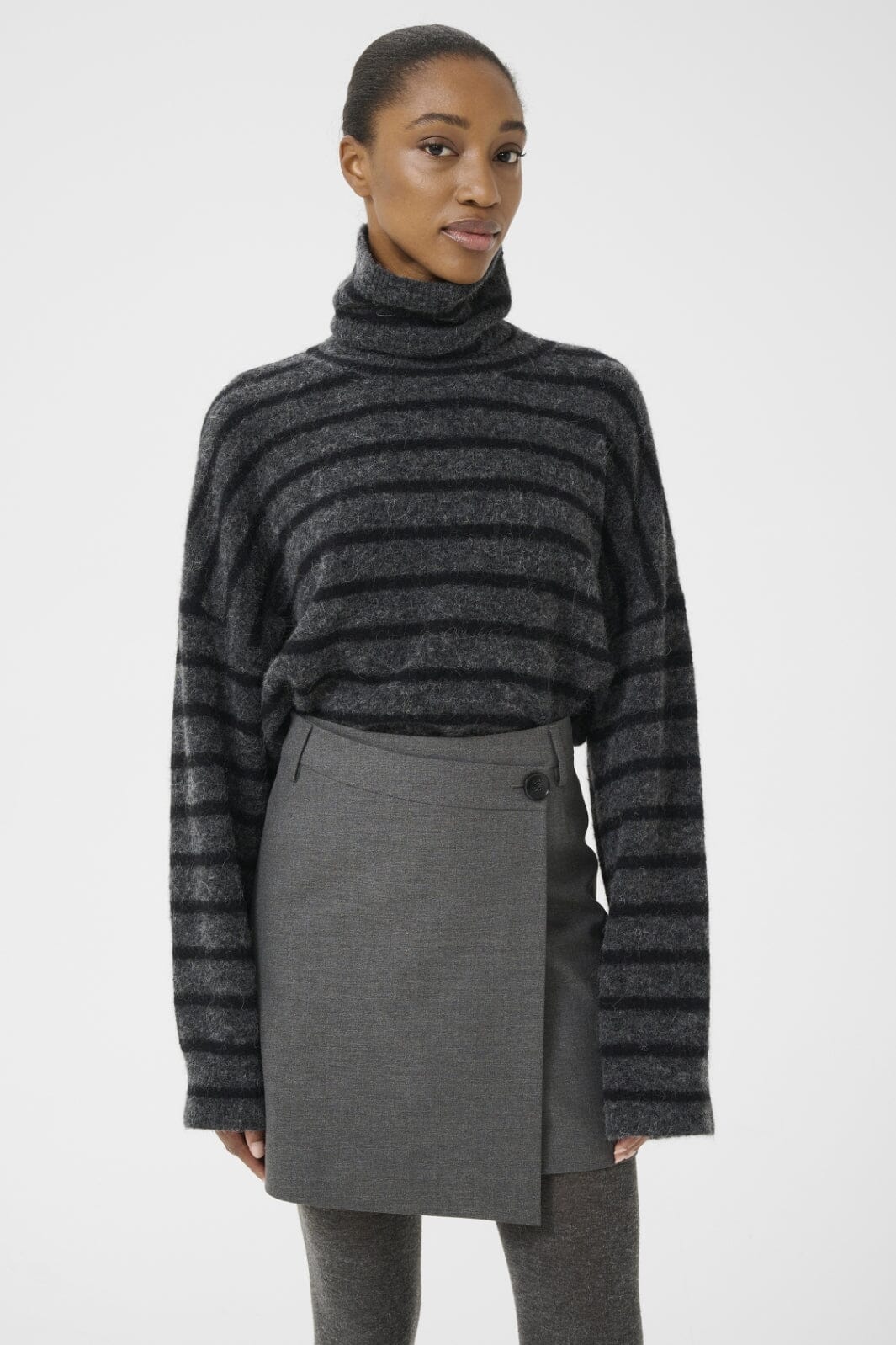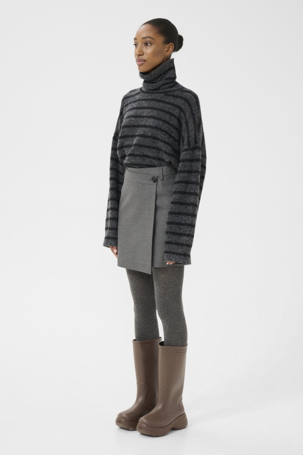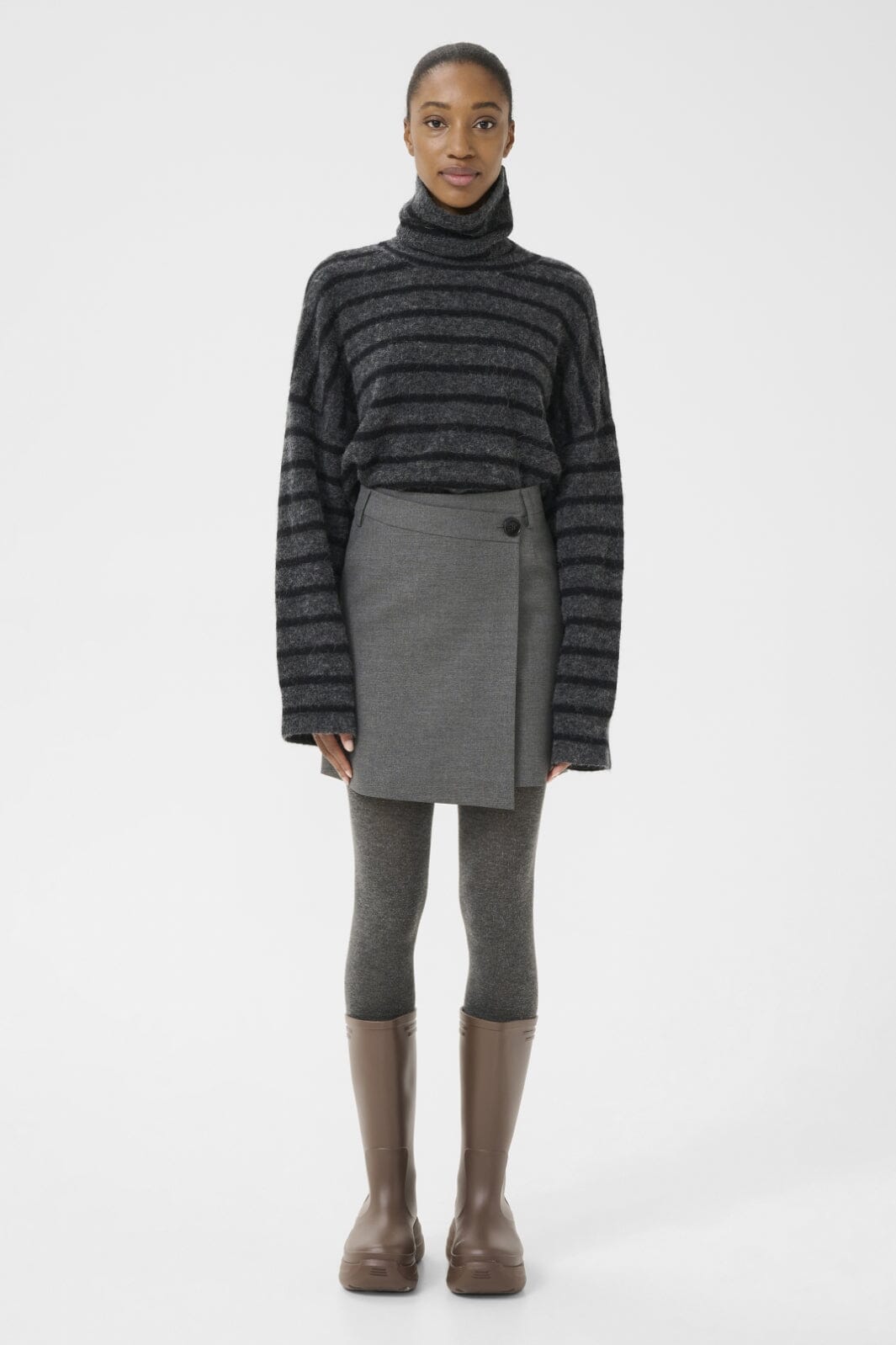Jupe portefeuille gris foncé de Gestuz avec des boutons sur le côté. La jupe a une surface mélangée et une silhouette mi-genou.