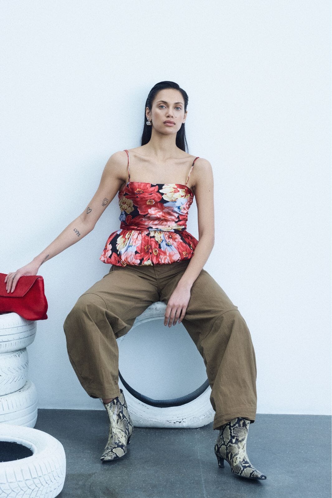 Haut en soie de Gestuz avec un motif fleuri dans des nuances de rouge, rose clair, jaune et bleu sur fond noir. Le haut présente un effet péplum au bas.