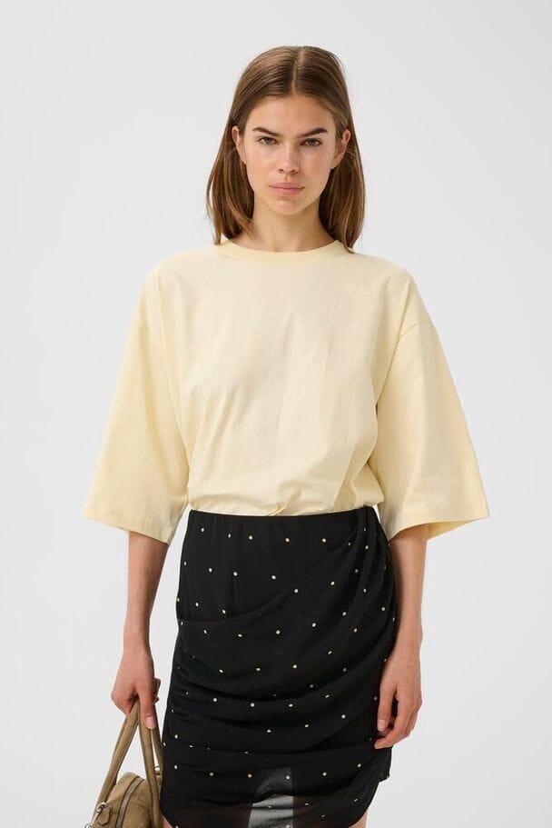 T-shirt jaune pâle de Gestuz, confectionné en 100 % coton biologique. Le t-shirt présente un détail brodé sur la poitrine et une coupe oversize.