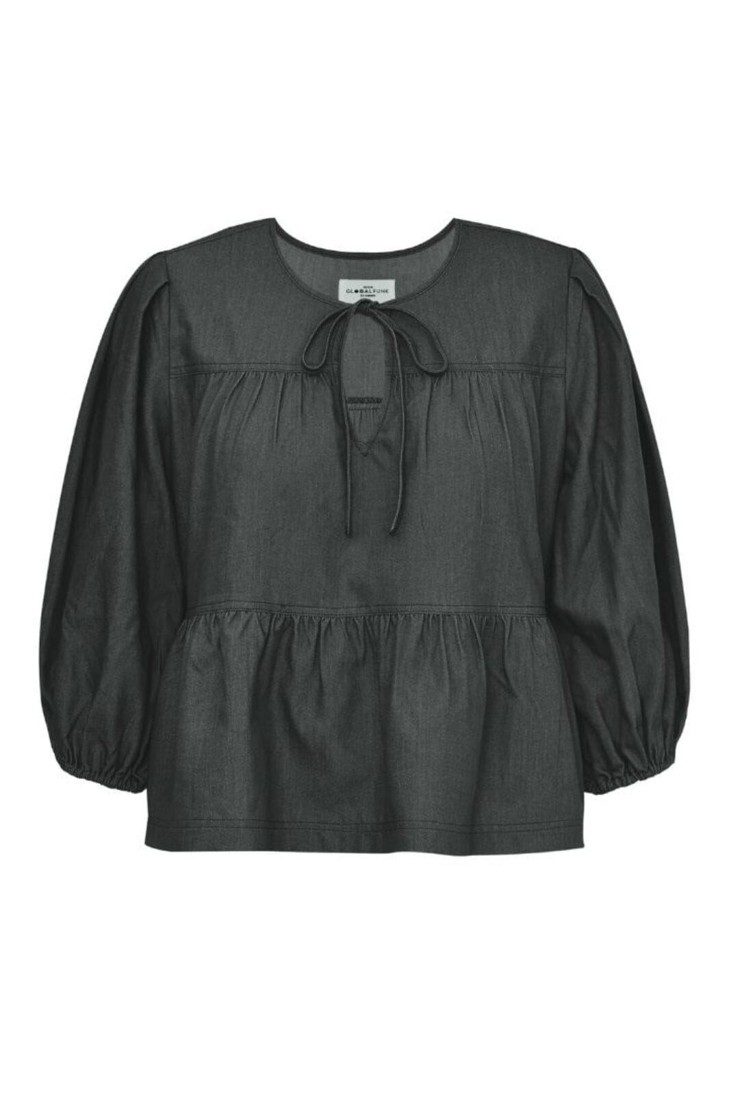 Blouse noire de Global Funk avec design en couches et volants. Col en V avec détails en lacet et manches bouffantes 3/4 avec poignets élastiques donnent à la blouse une touche féminine.