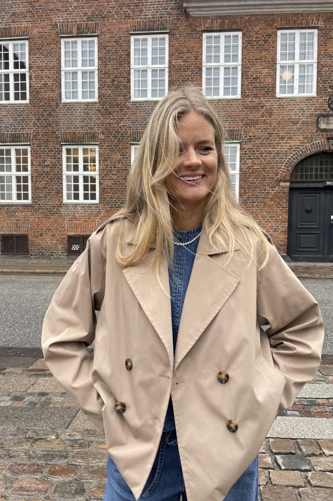Veste beige de Global Funk avec une fermeture à double boutonnage. Elle a de gros boutons et un col classique qui donne à la veste une expression propre et simple.