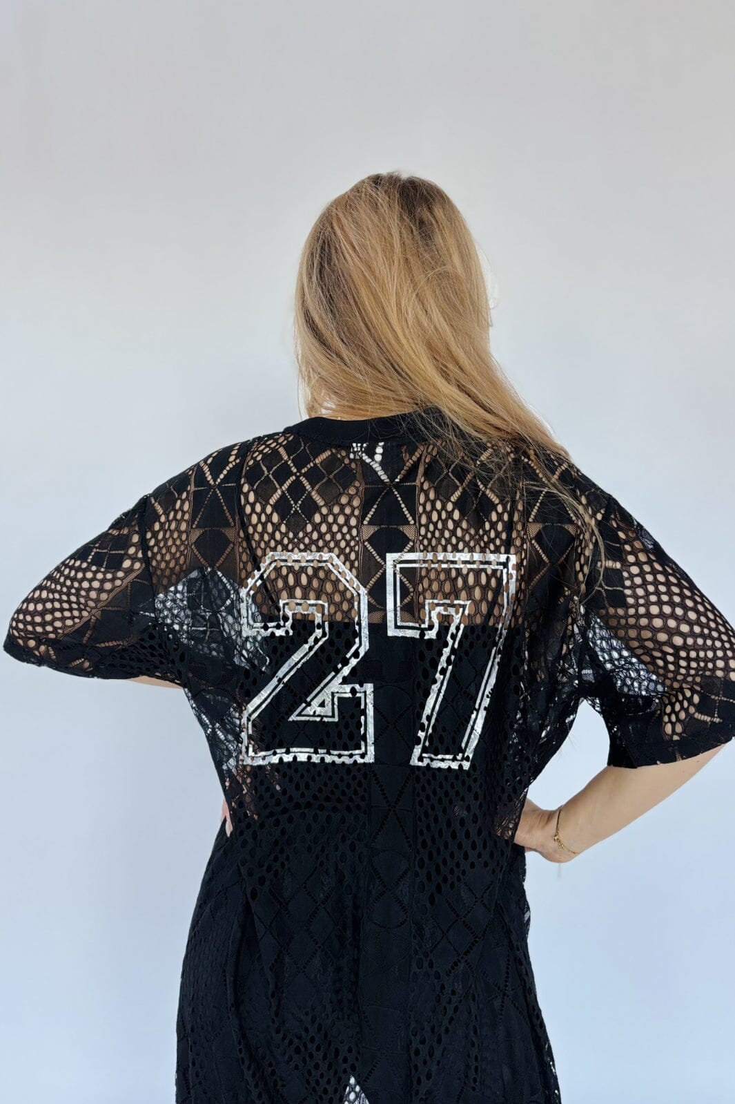 Robe t-shirt noire de Gossia avec des motifs géométriques en tissu ressemblant à un filet. La robe a des manches courtes et un col rond avec des broderies et des détails en dentelle sur l'ensemble du design.