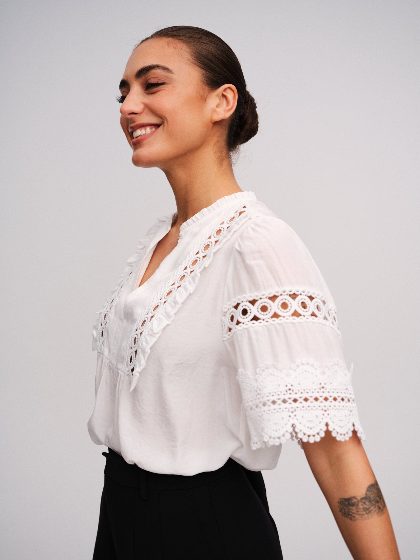Blouse de la marque Gossia en off-white. Elle est composée de 57% polyamide et 43% viscose avec des détails en dentelle et des volants.