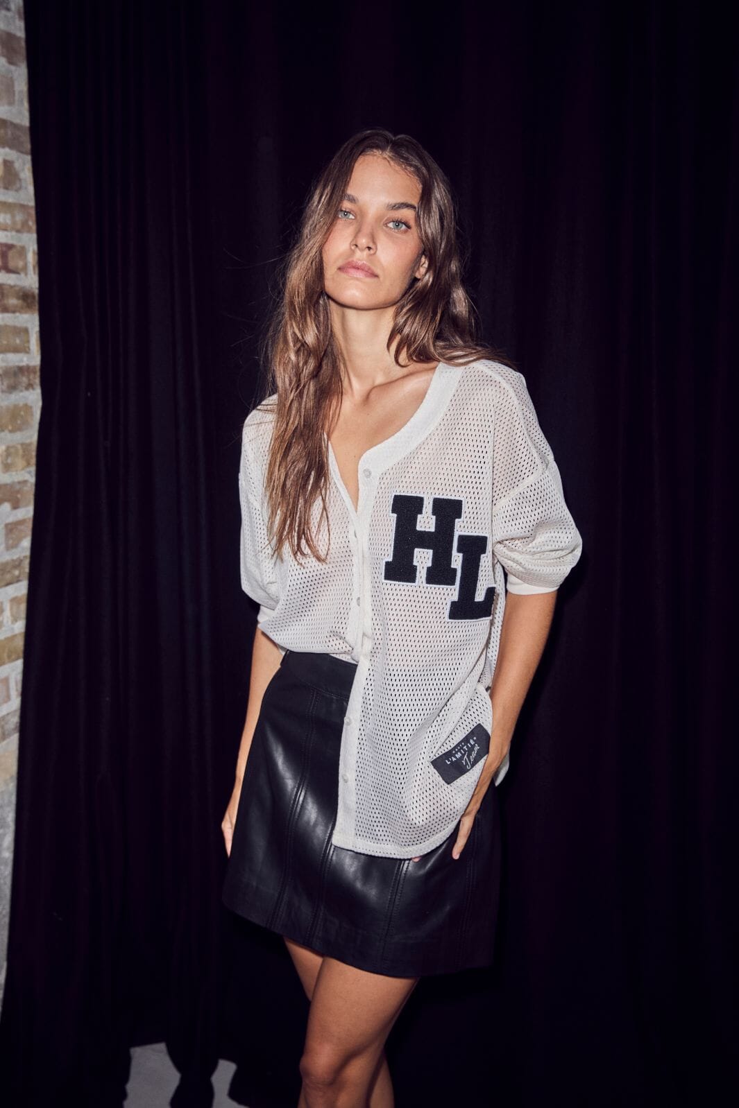 Blouse Haute L'Amitié dans une nuance blanche nacrée. La blouse est confectionnée dans un tissu de type mesh avec des lettres HL noires sur le côté gauche de la poitrine.