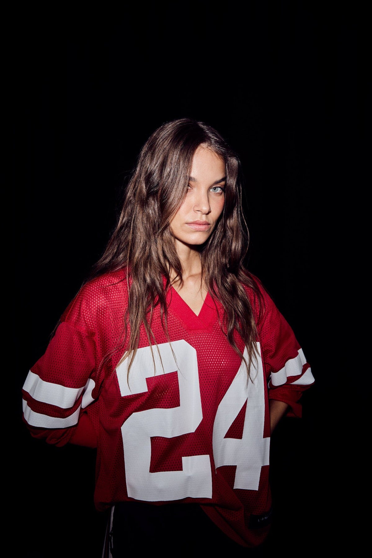 T-shirt rouge à manches longues de Haute L'Amitié en tissu mesh, avec un grand numéro 24 blanc sur le devant et deux bandes blanches sur les manches.