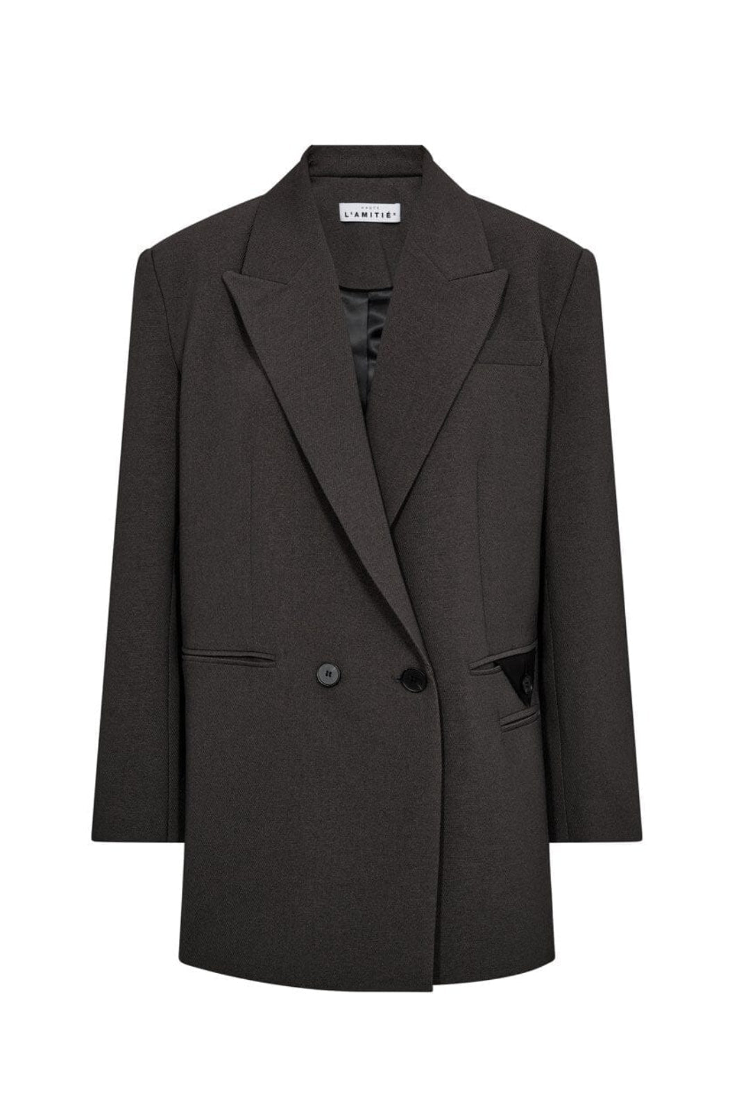 Blazer oversize de Haute L'Amitié en gris foncé. Le blazer possède une fermeture croisée à l’avant avec deux boutons visibles et de larges revers.