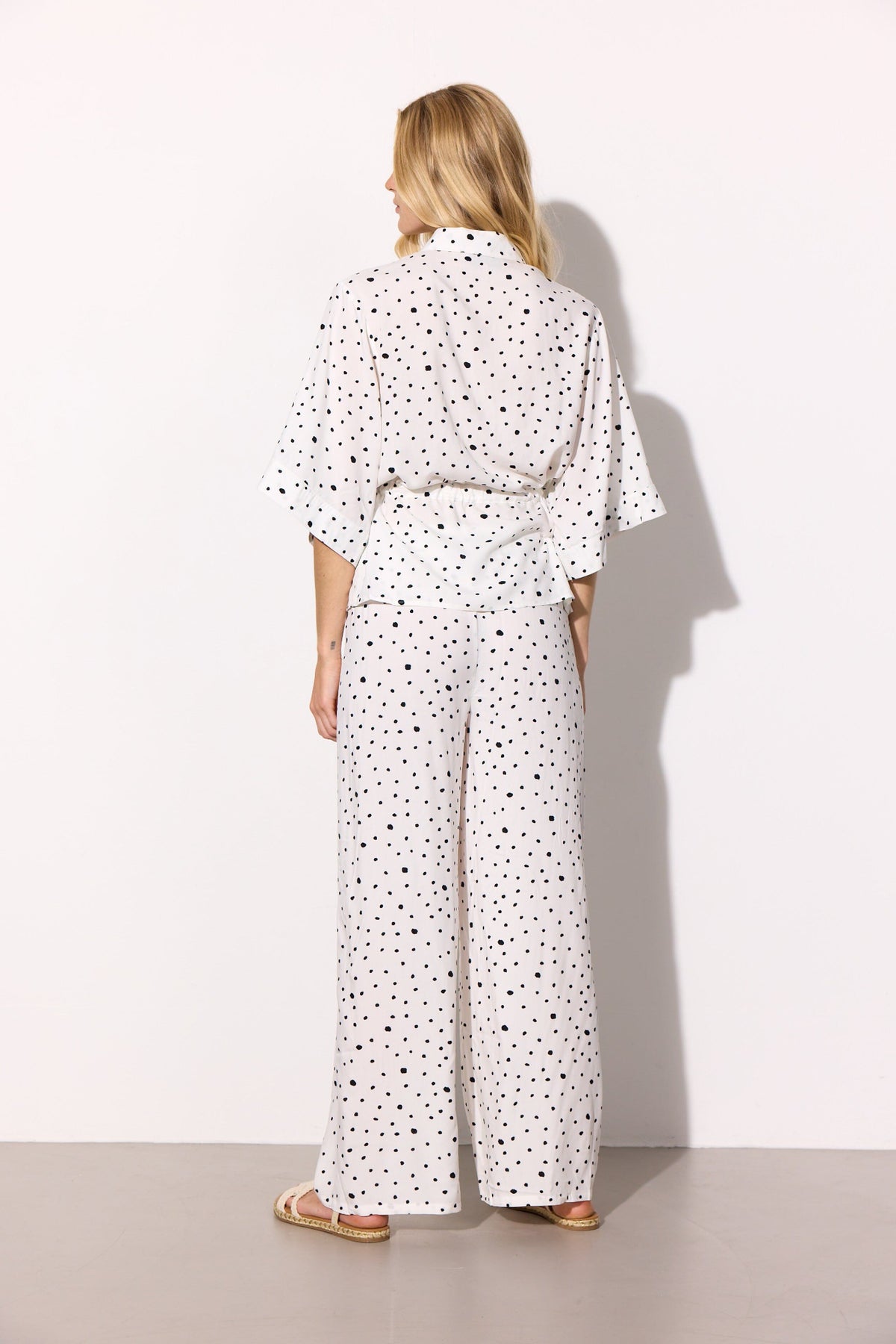 Chemise kimono blanche de Hunkøn à pois noirs. La chemise possède un col de chemise classique et des manches amples avec épaules tombantes.