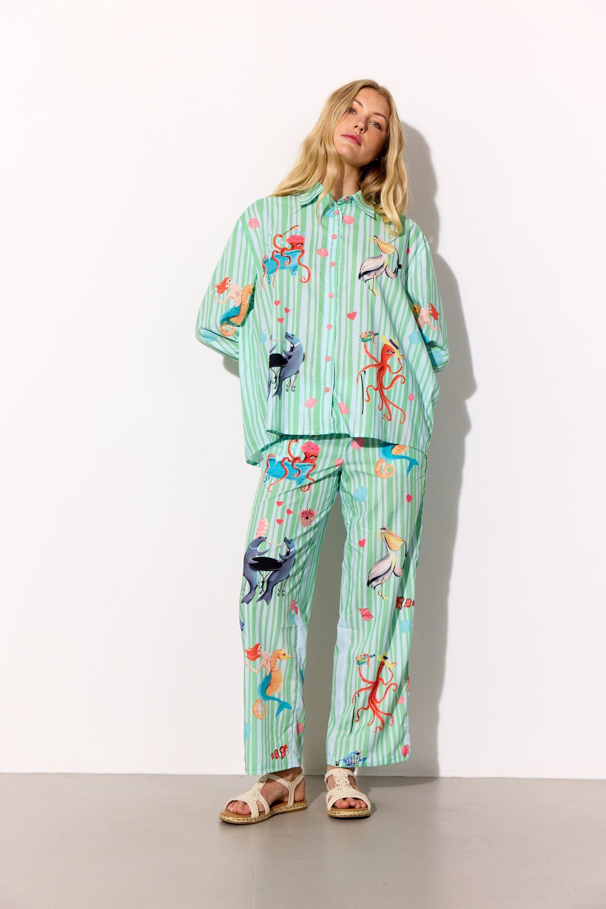 Chemise de Hunkøn en Green Ocean Art Print. Le motif multicolore associe des rayures vertes et blanches à des illustrations inspirées de la mer représentant des pieuvres, des hippocampes et des oiseaux.