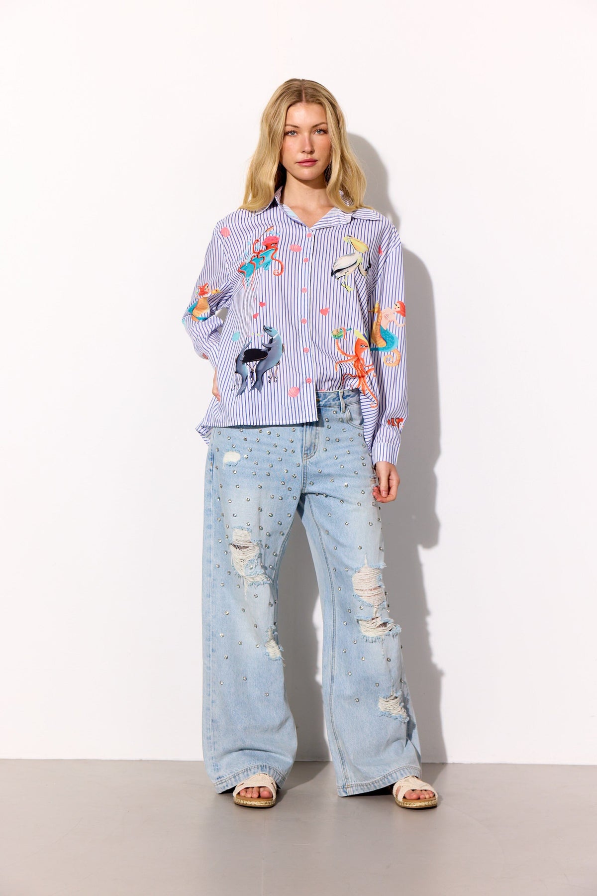 Jean en denim bleu clair de Hunkøn avec de petits clous décoratifs sur le devant. Ce jean convient aussi bien aux journées décontractées qu’aux occasions festives.