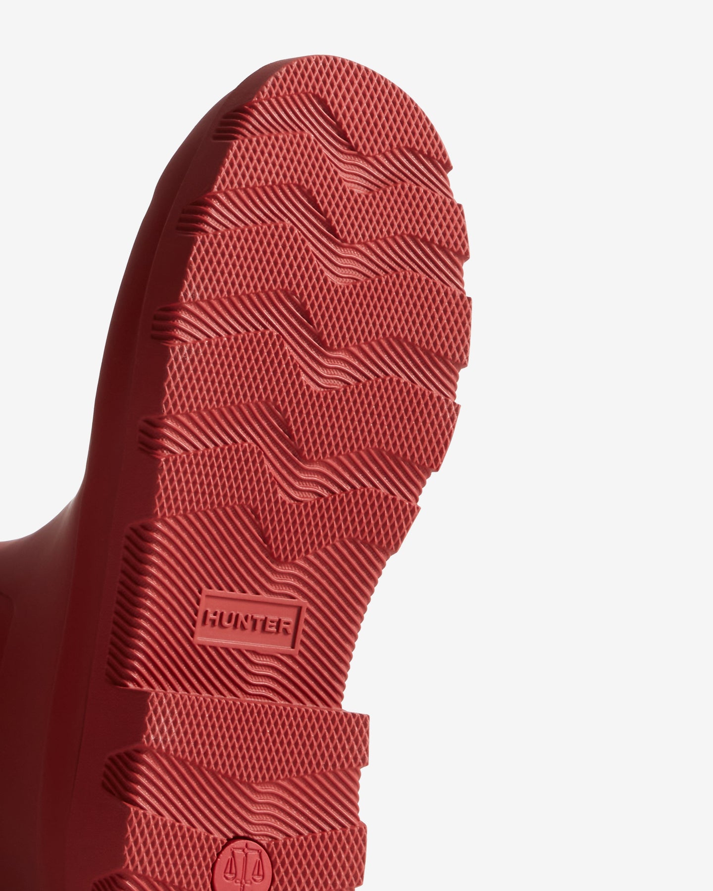 Botte courte de Hunter dans une nuance rouge militaire. La botte est fabriquée en 100% caoutchouc et porte le logo Hunter sur le devant.