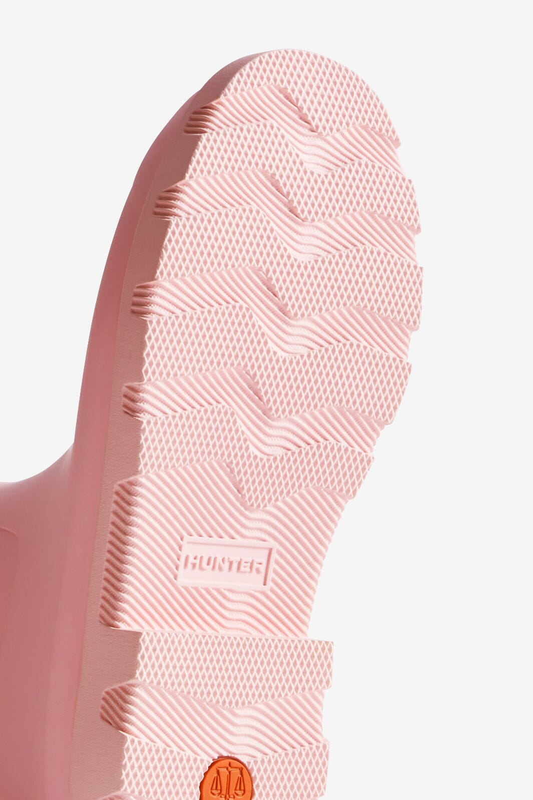 Bottes en caoutchouc courtes de Hunter de couleur rose. Les bottes présentent un design uniforme avec le logo Hunter sur le devant et une semelle à motif.