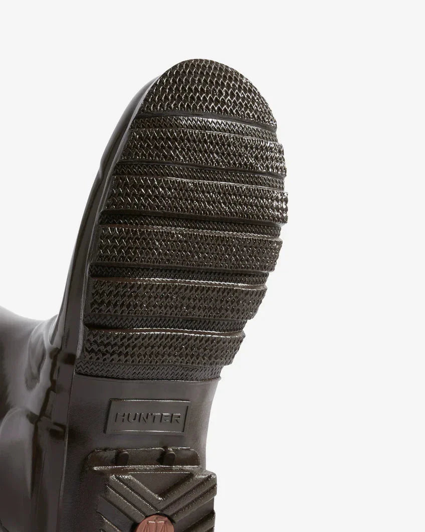 Bottes hautes Hunter de couleur brun chocolat avec une finition brillante. Les bottes sont en caoutchouc et montent jusqu’au-dessous du genou.