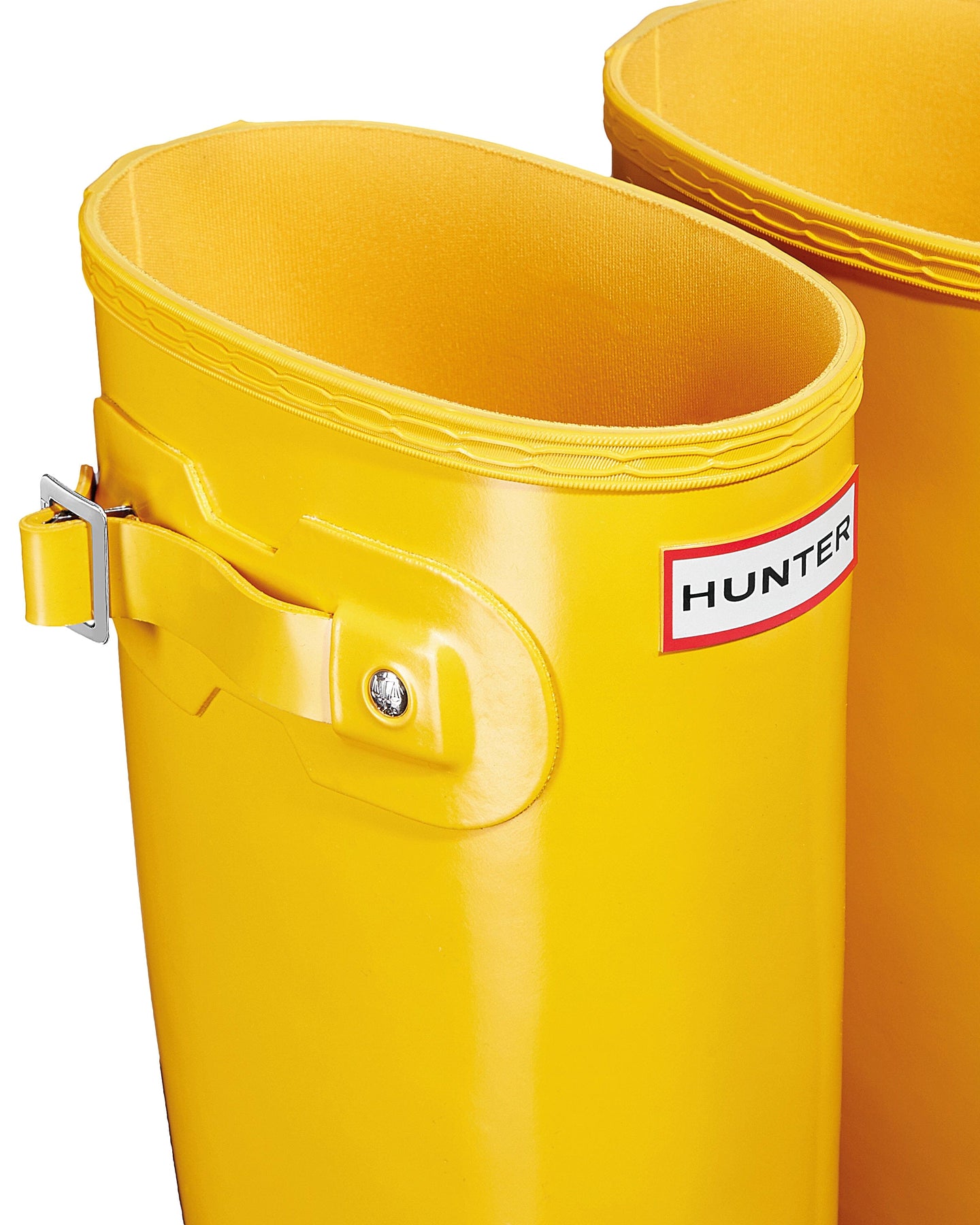 Bottes en caoutchouc Hunter de couleur jaune avec une finition brillante. Les bottes sont fabriquées en 100 % caoutchouc et possèdent un talon bloc.