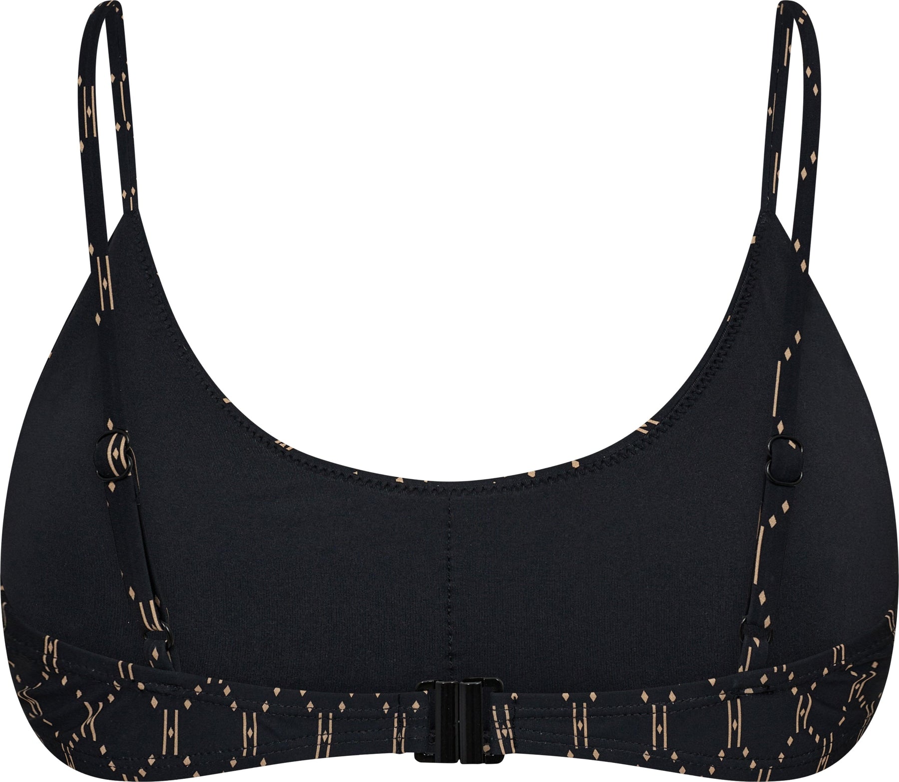 Haut de bikini noir de Hype The Detail avec motif géométrique beige sur fond noir. Le haut possède de fines bretelles et une encolure ronde.