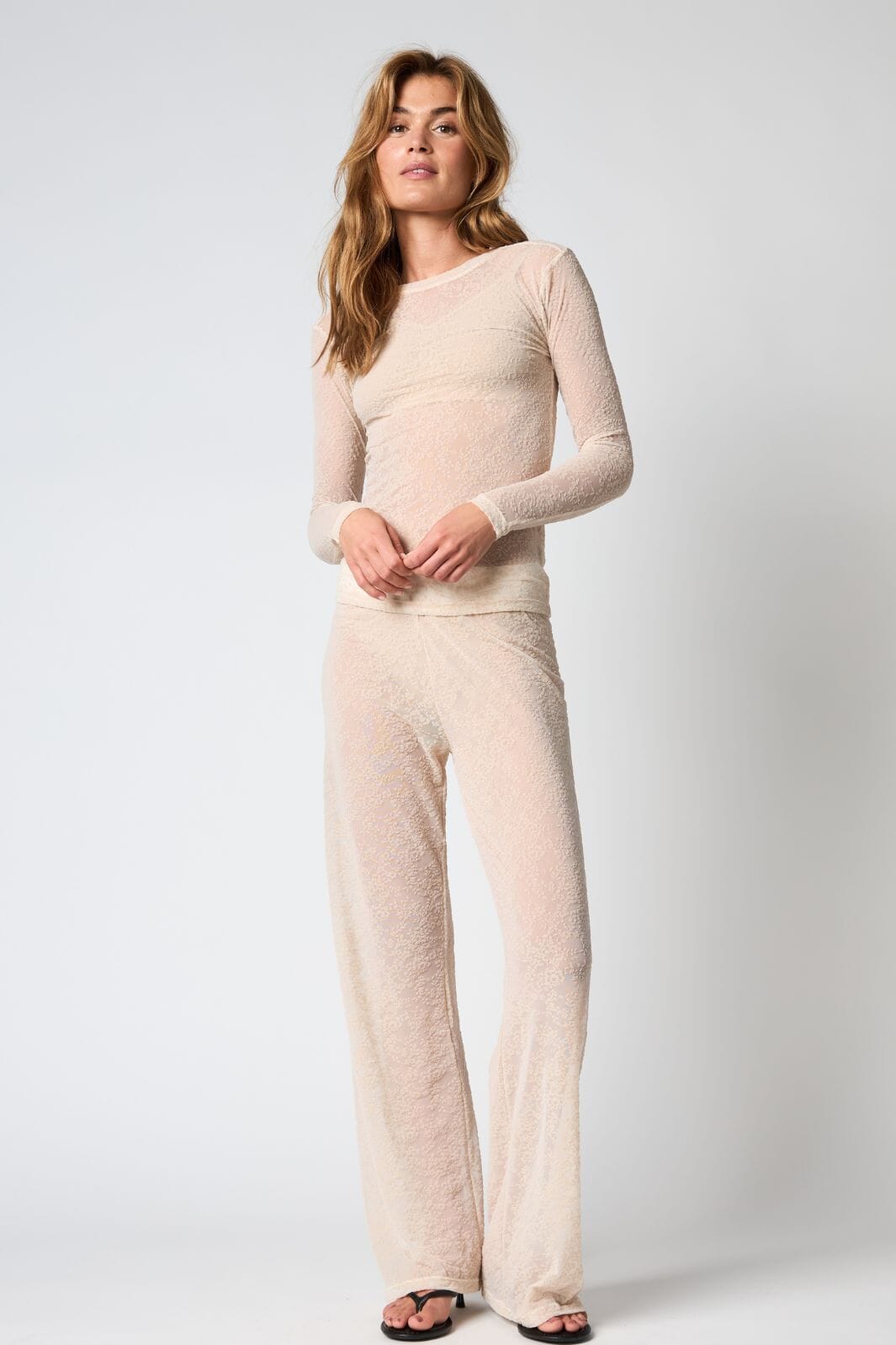 Blouse en dentelle de Hype The Detail dans une teinte poudre claire. La blouse présente un motif floral en dentelle sur l’ensemble du tissu et des manches longues.