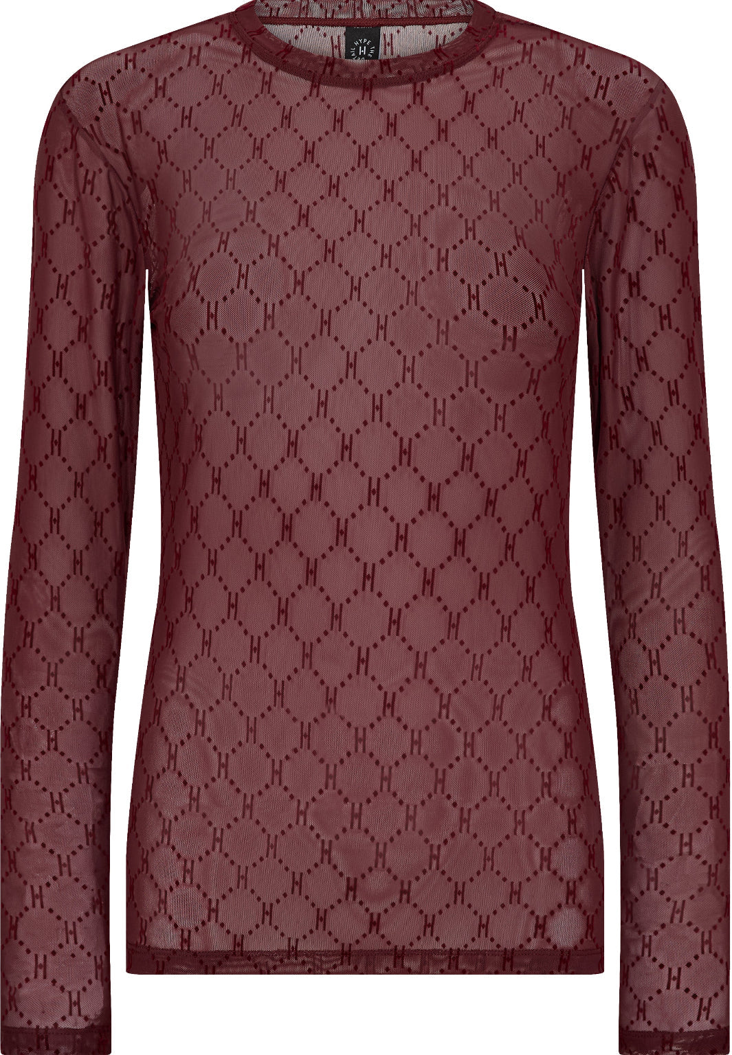 Blouse en mesh noire avec impression Hype The Detail. La blouse a un motif en filet transparent et des manches longues avec un col rond. La coupe ajustée suit les lignes du corps.