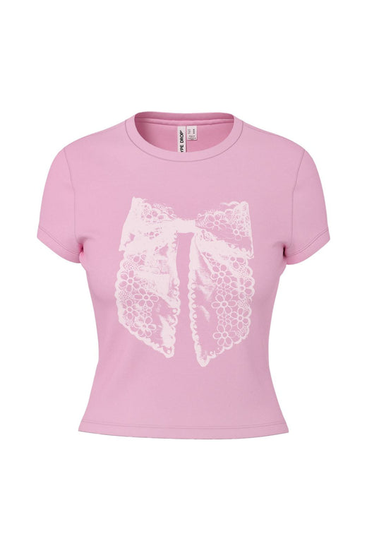 T-shirt court rose de Hypedrop avec imprimé nœud et fleurs blanc sur le devant. Le t-shirt a des manches courtes et une encolure ronde.