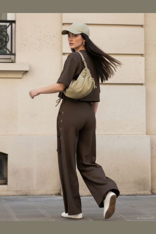 Pantalons de jogging de Hypedrop en marron foncé. Les pantalons ont une coupe ample avec des détails en cordon sur les côtés et une taille haute.