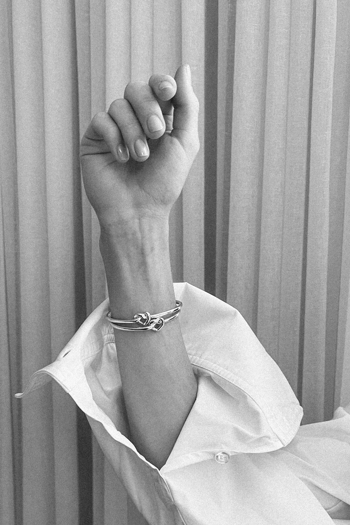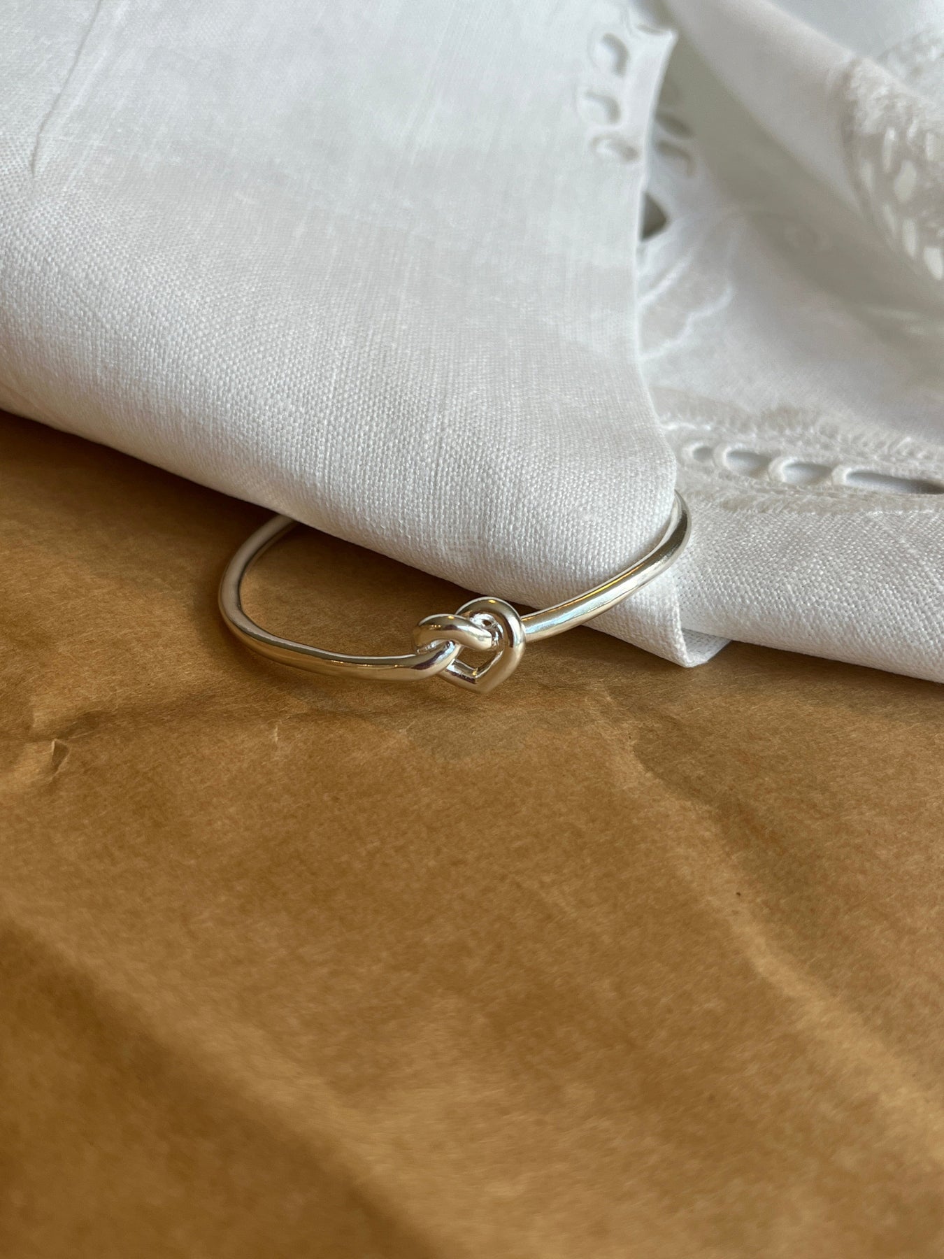 Bracelet de Jane Kønig avec un cœur noué comme détail central. Le bracelet est en argent sterling et présente une surface lisse et brillante, plaquée or 18 carats.