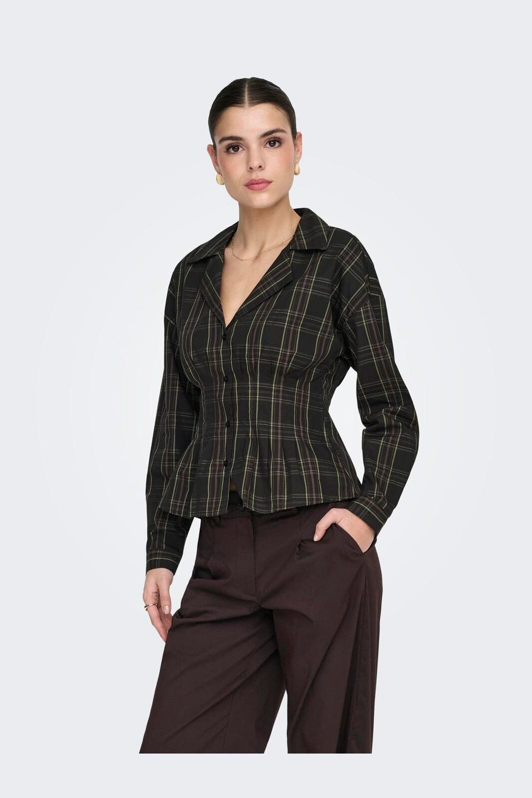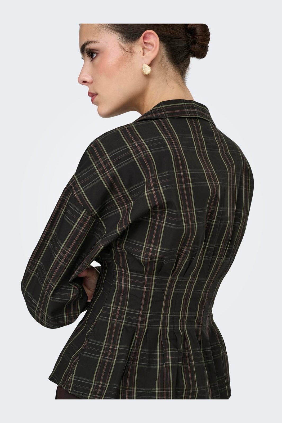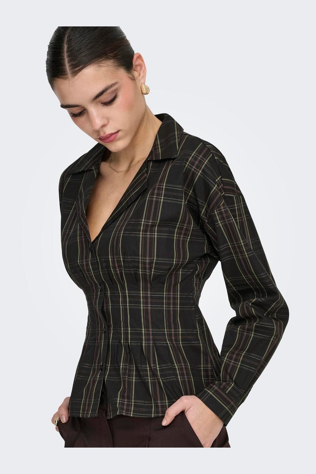 Chemise à carreaux de JDY en noir avec des carreaux verts et rouges. La chemise est fabriquée en coton biologique et présente une coupe cintrée.