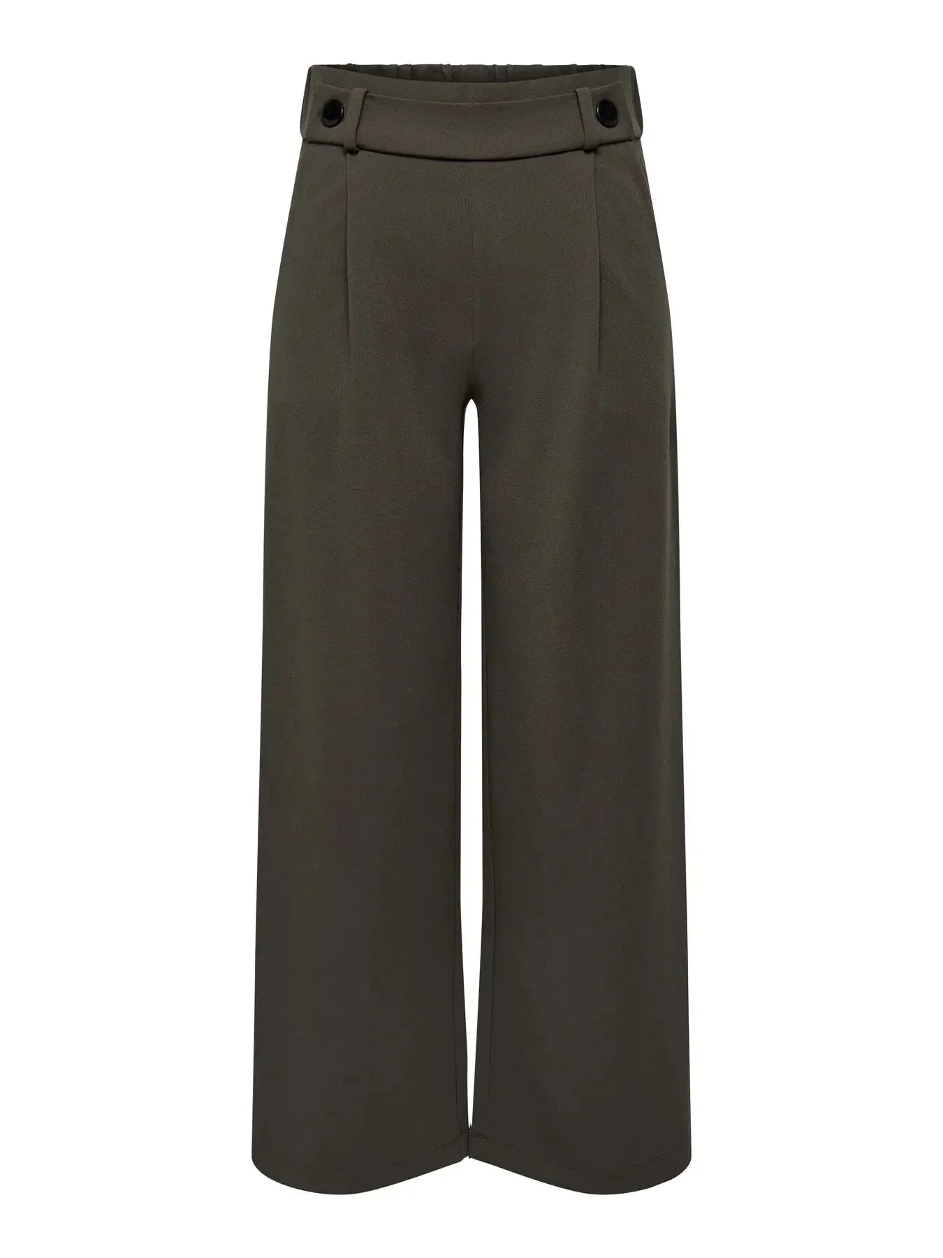 Pantalon brun chocolat de JDY avec des boutons noirs. Le pantalon présente une coupe ample avec des jambes larges et une taille haute.