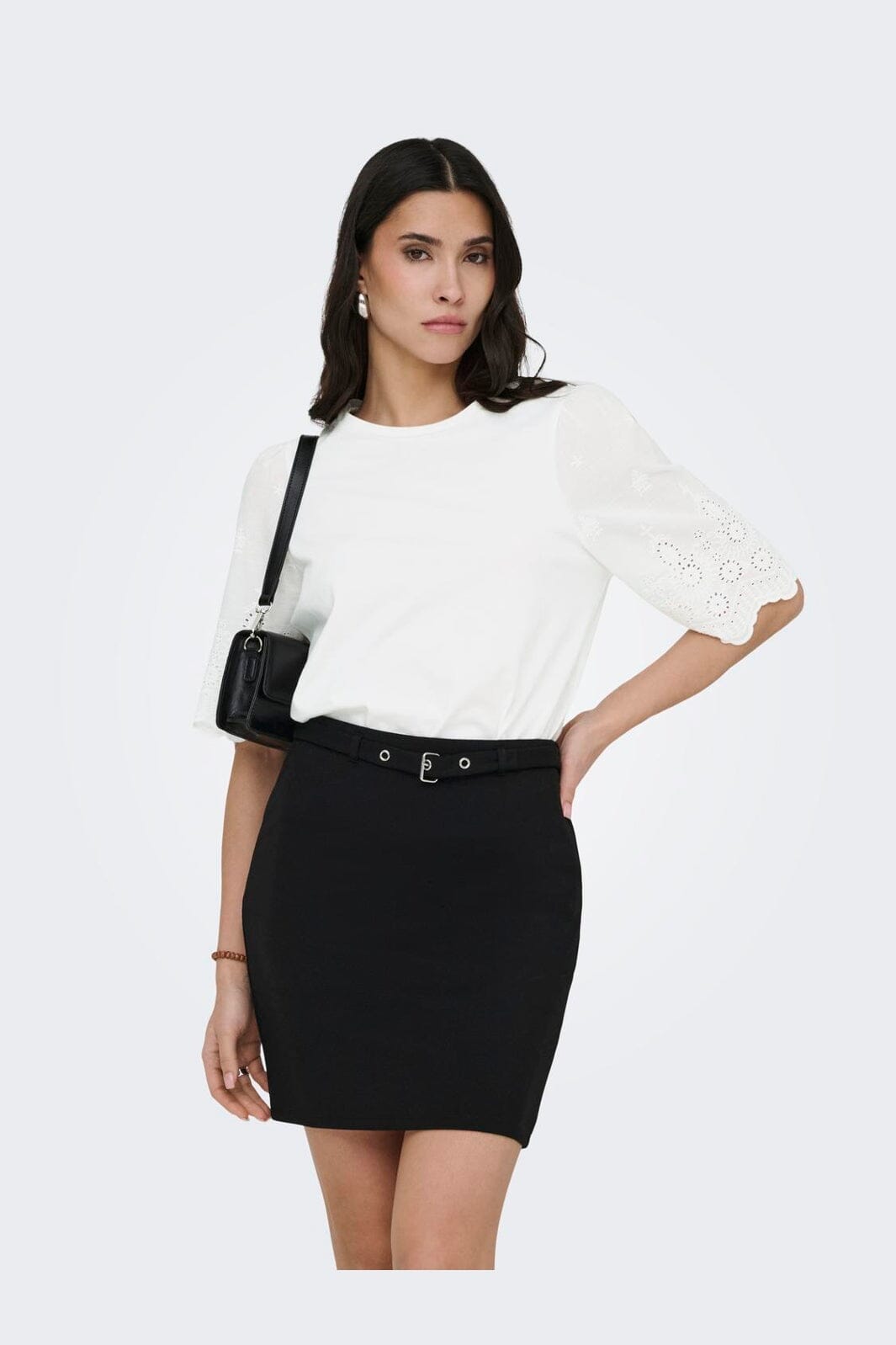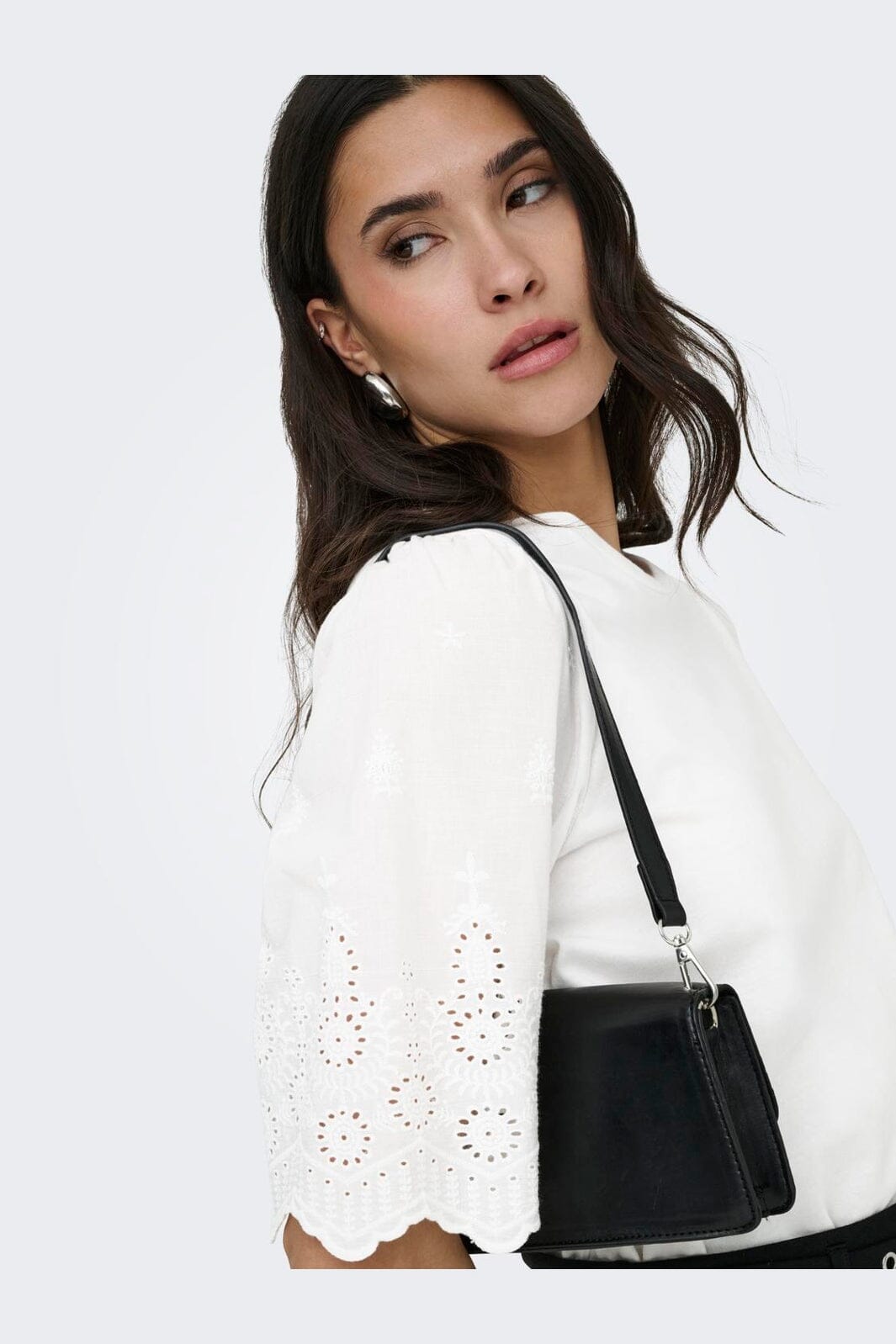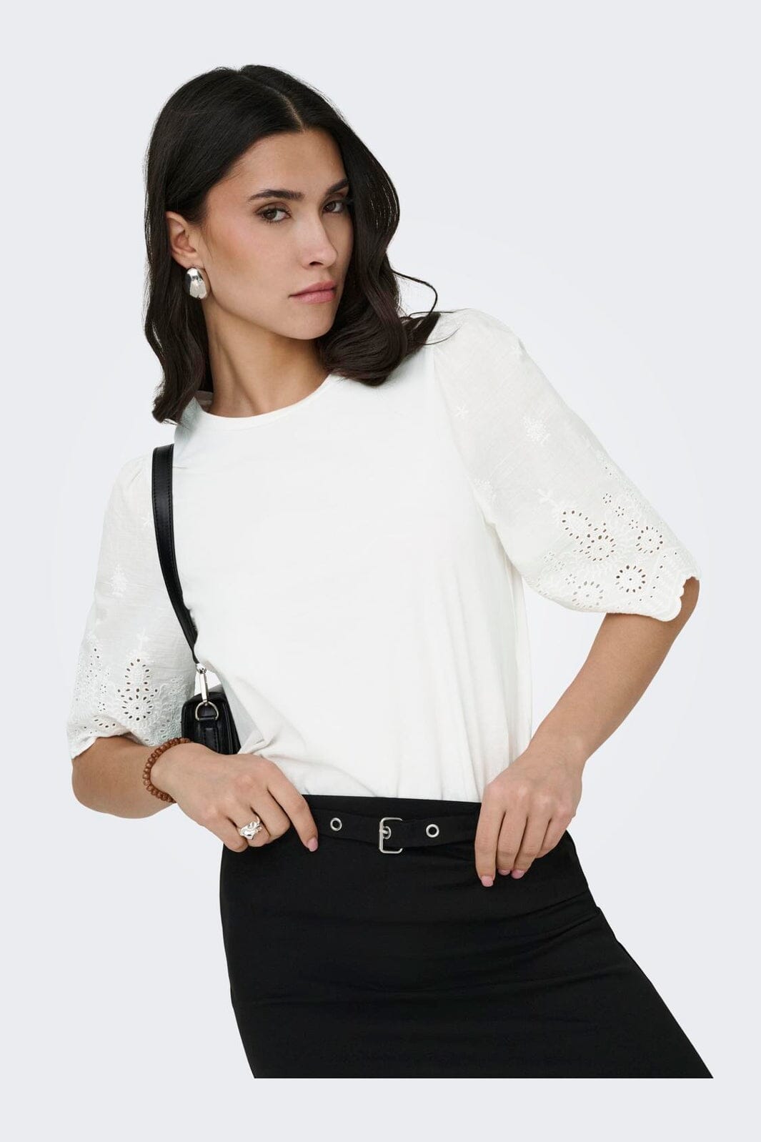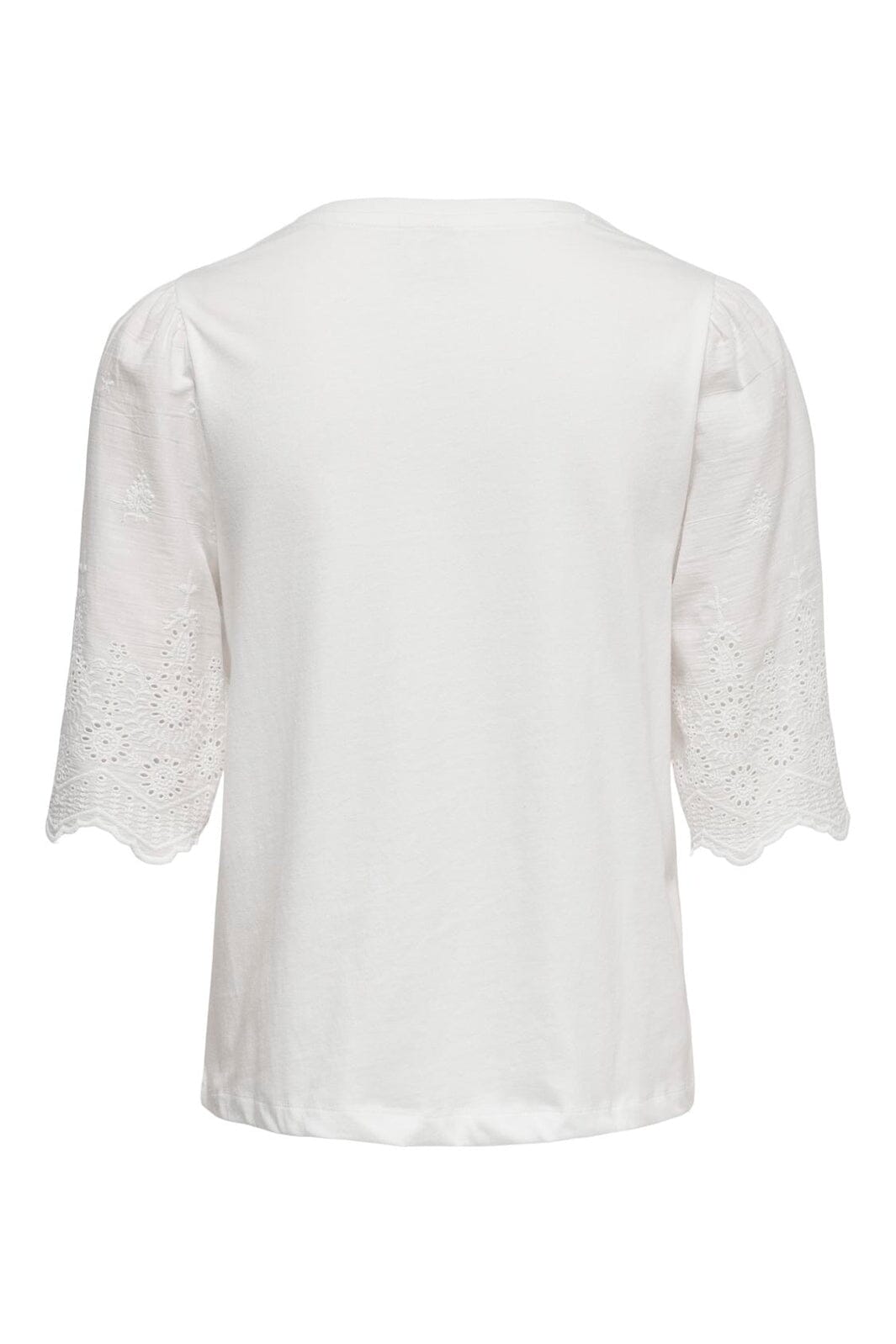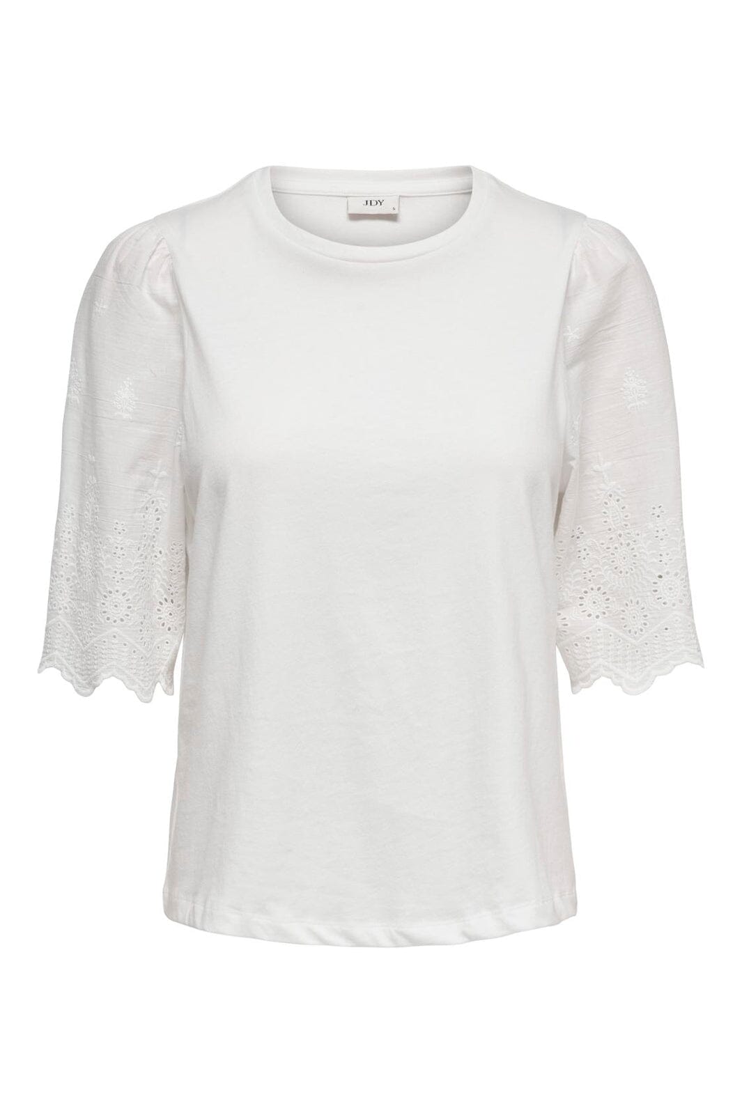 Haut blanc de JDY, fabriqué en coton biologique. Le haut possède des manches courtes avec des détails brodés et une encolure ronde.