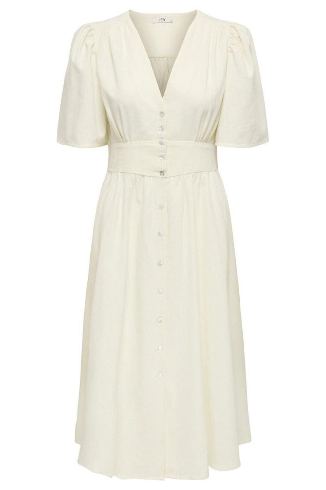 Robe midi couleur crème de JDY avec décolleté en V et manches bouffantes. La robe a des boutons sur toute la longueur devant et une taille marquée avec un détail smock au dos.