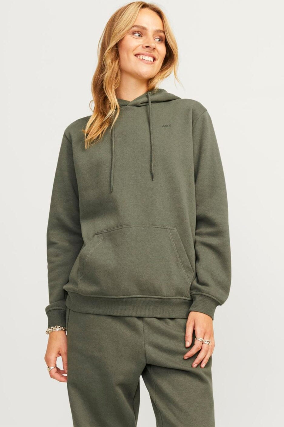 Haut à capuche vert de Jjxx avec une coupe décontractée. Fabriqué en coton doux et en polyester recyclé avec des détails brodés et un logo discret sur la poitrine.