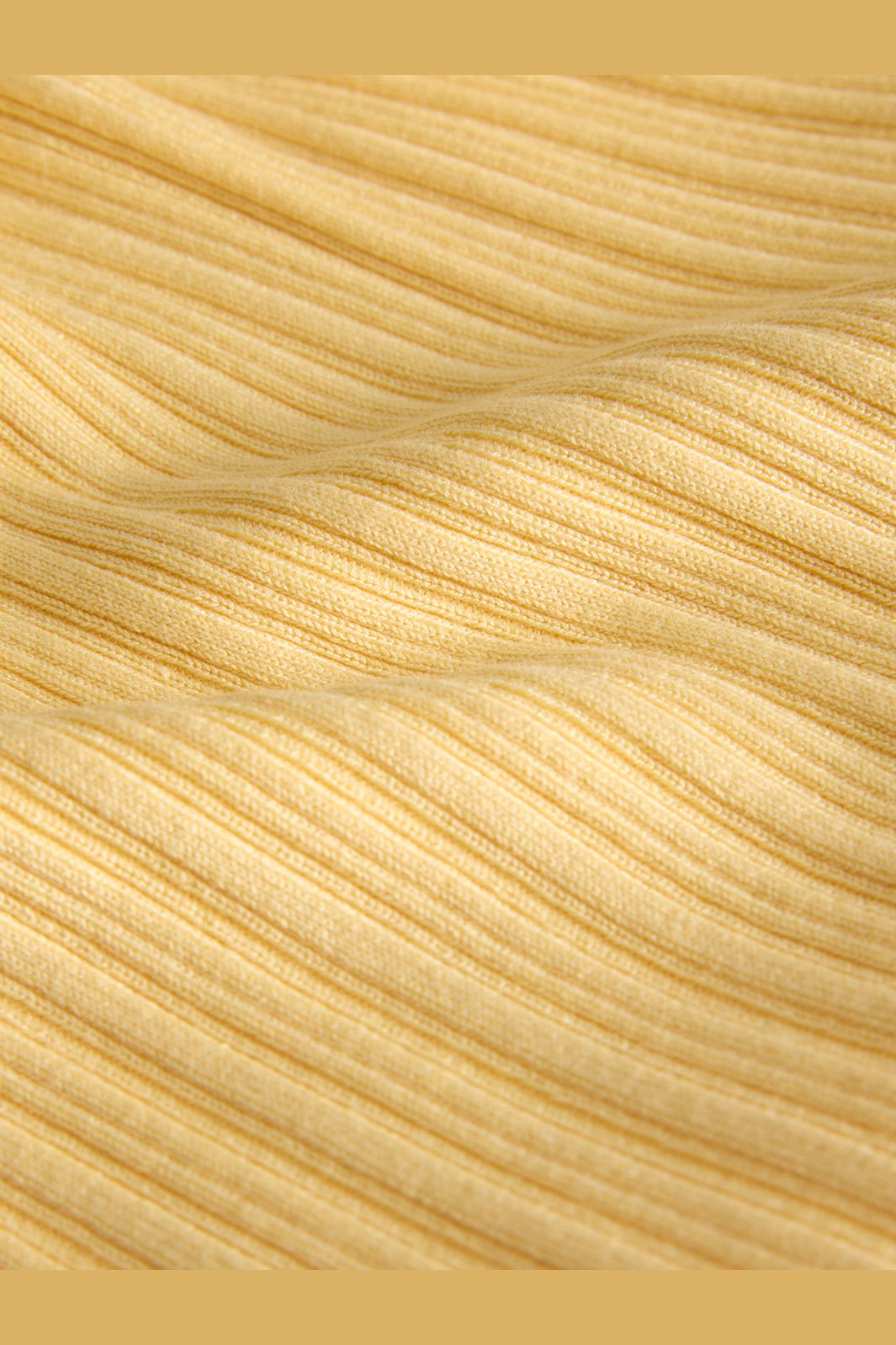 Un polo en maille jaune de Jjxx avec côtes et rayures verticales. Le polo présente une coupe ajustée et des manches courtes.