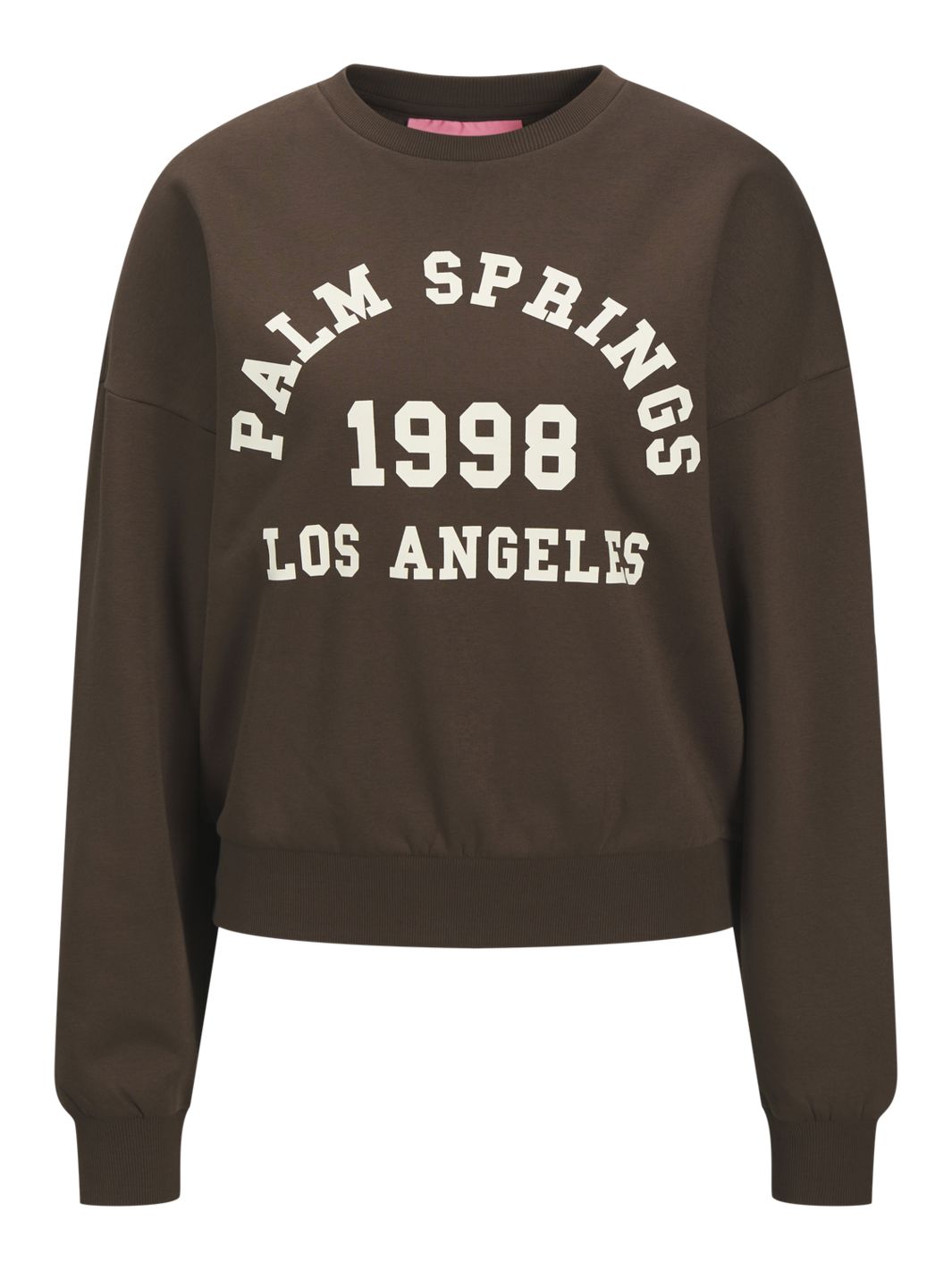 Sweatshirt brun de Jjxx avec une coupe décontractée et un col rond. Impression graphique sur le devant avec le texte Palm Springs 1998 Los Angeles dans des couleurs contrastées.