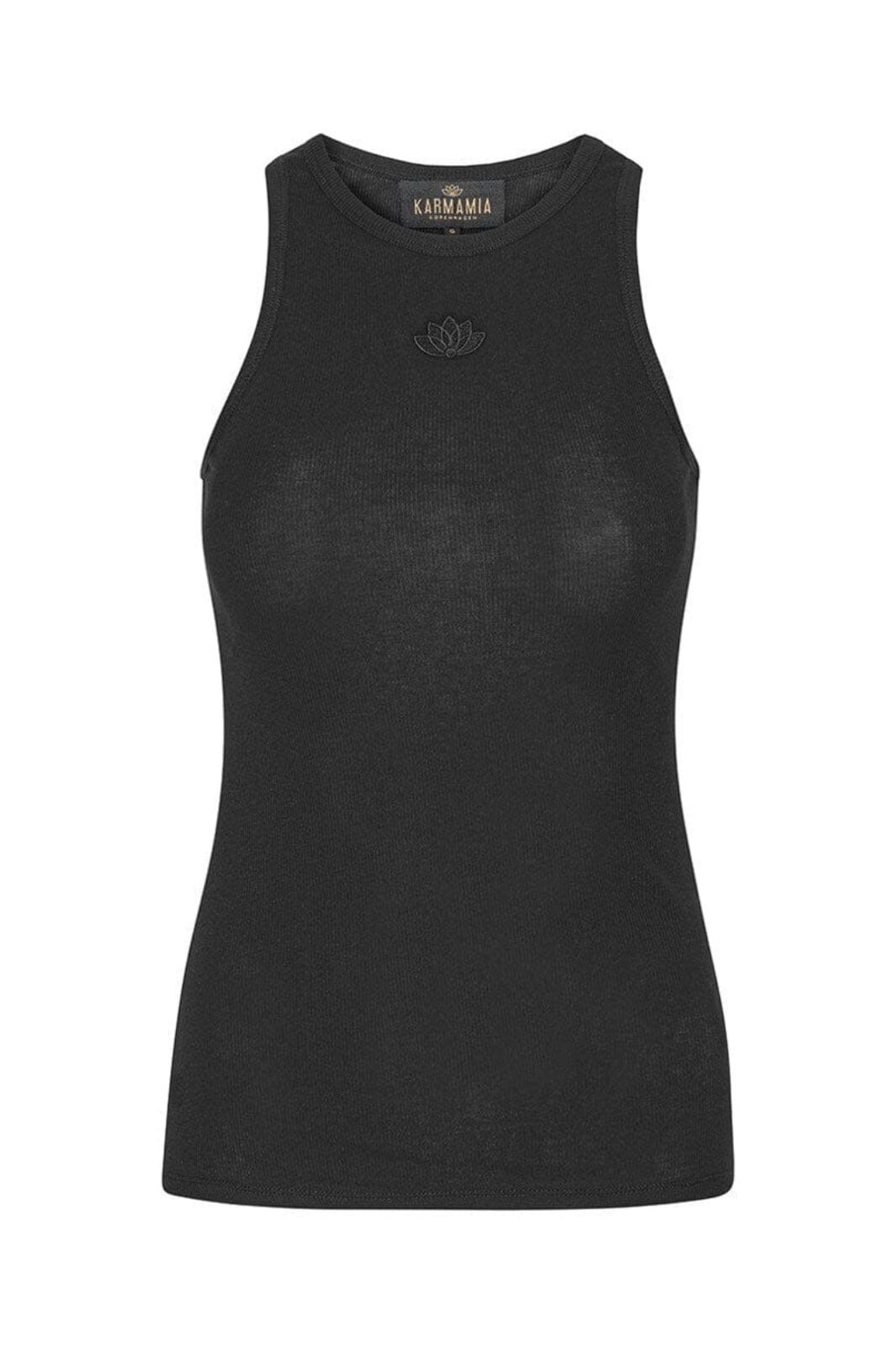 Débardeur noir de Karmamia avec encolure ronde. Le top a une fleur de lotus brodée sur le devant et est fabriqué en coton Pima avec élasthanne.