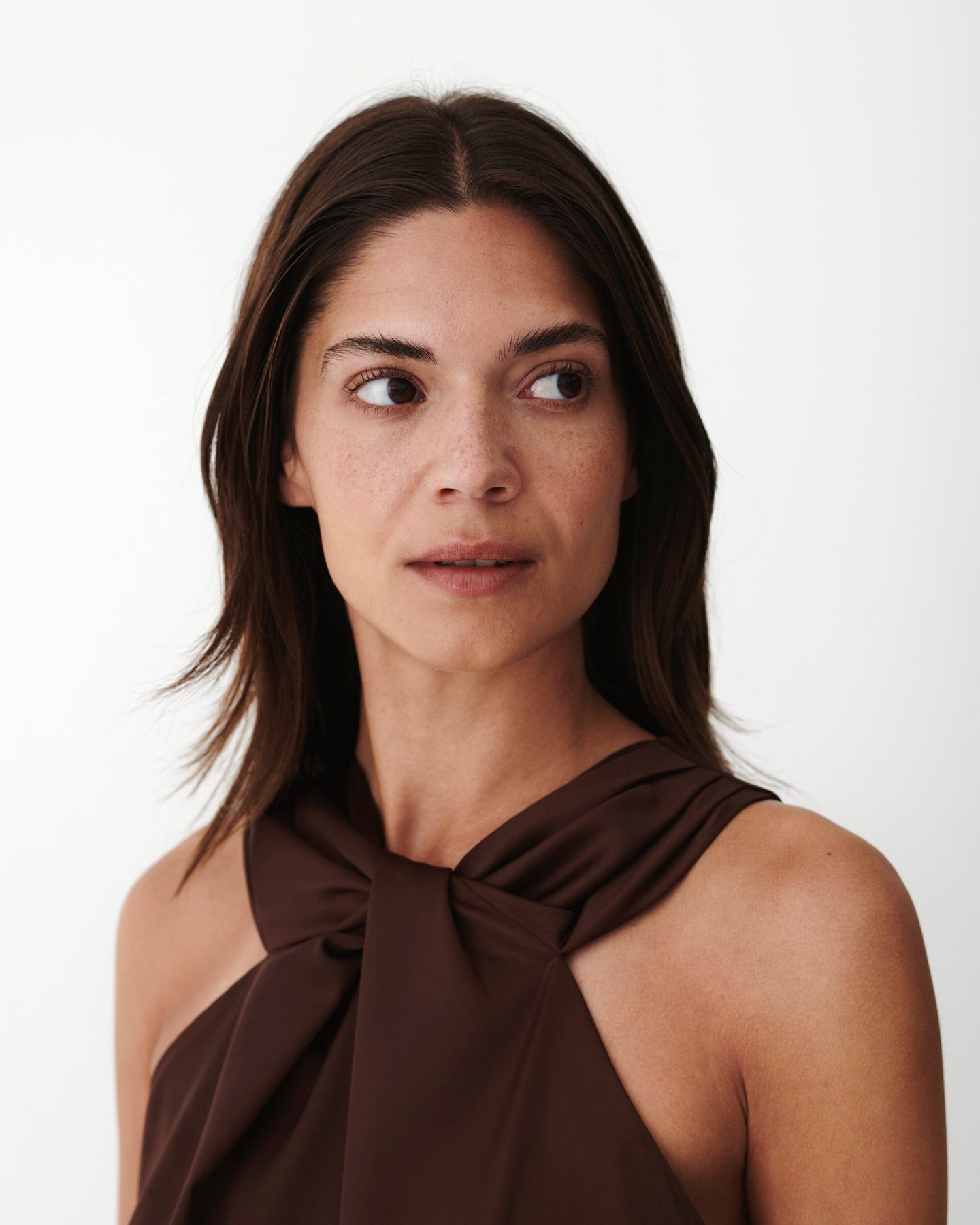 Top brun de Karmamia avec col montant et détail noué. Le modèle sans manches a une coupe régulière et se ferme avec des boutons. Le top convient à la fois pour des occasions formelles et festives.