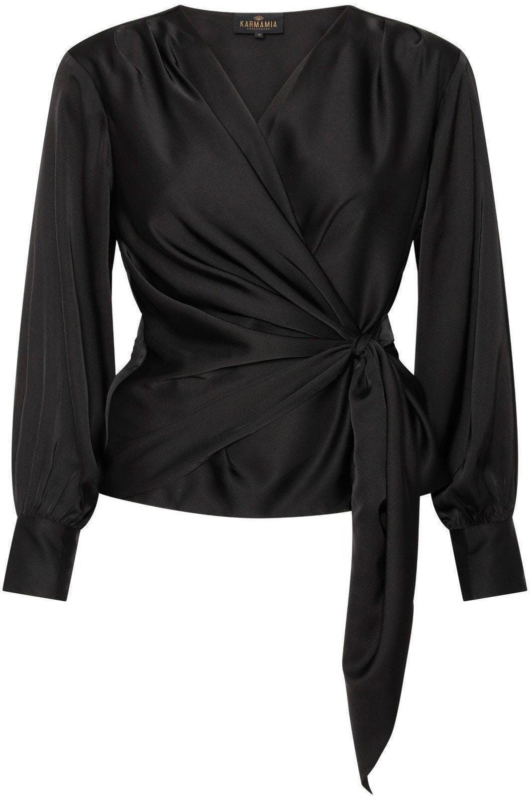 Blouse en satin noir avec design enveloppant et lien à la taille. La surface lisse donne à la blouse une expression brillante, et le décolleté en V crée un joli col.