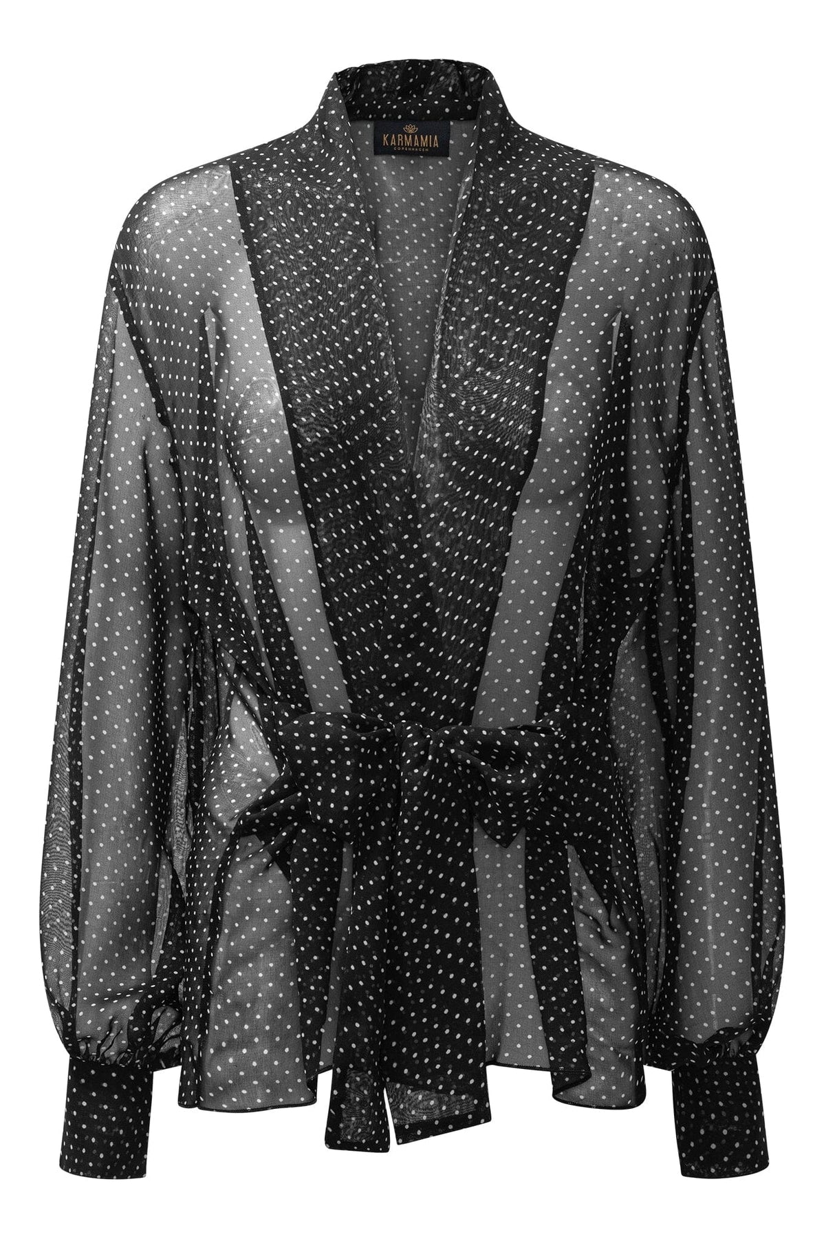 Blouse portefeuille noire de Karmamia à pois blancs. La blouse est en matière mesh transparente 100 % polyester et possède un lien à nouer pour la fermeture.