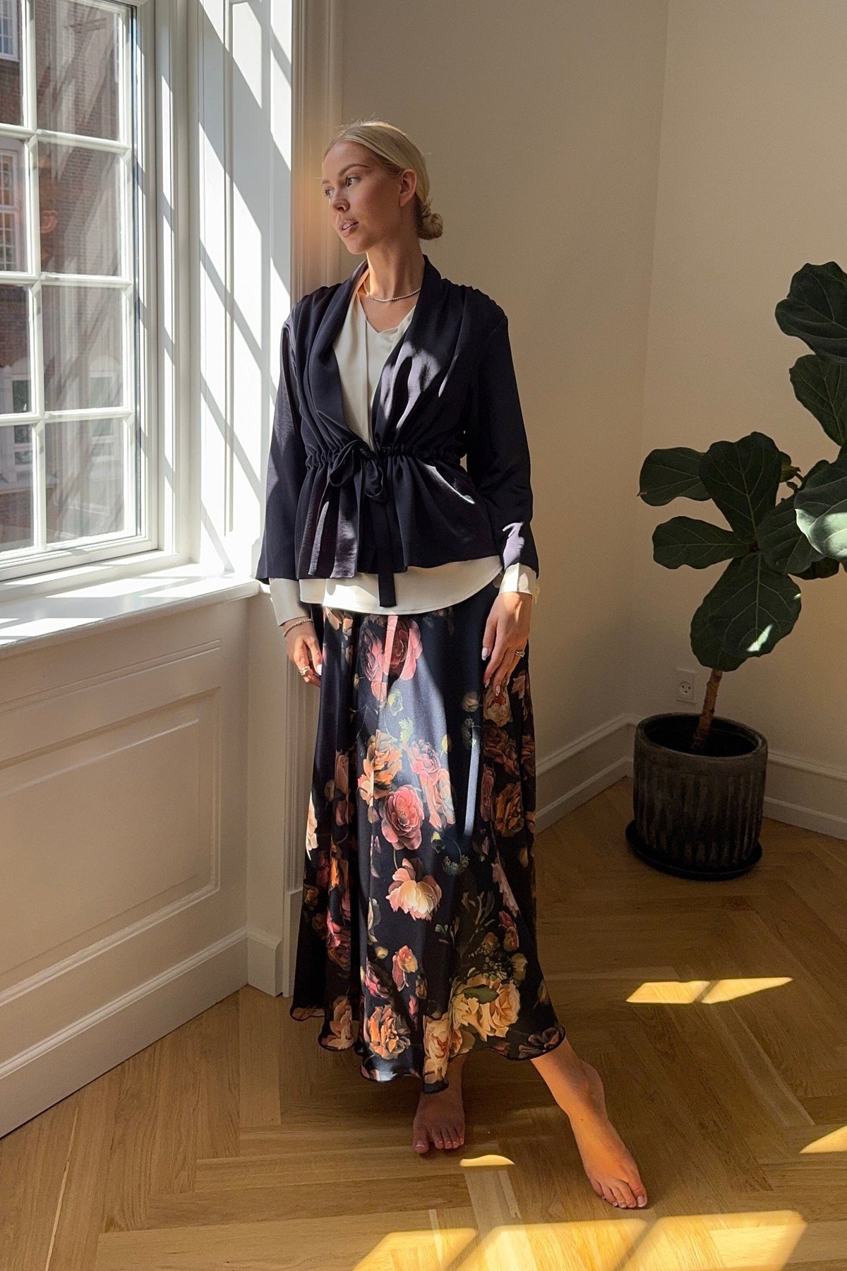 Jupe noire de Karmamia avec motif floral dans des nuances de rose, pêche et crème. Elle a une taille haute et arrive au milieu du mollet. Le tissu tombe doucement et a une surface lisse.