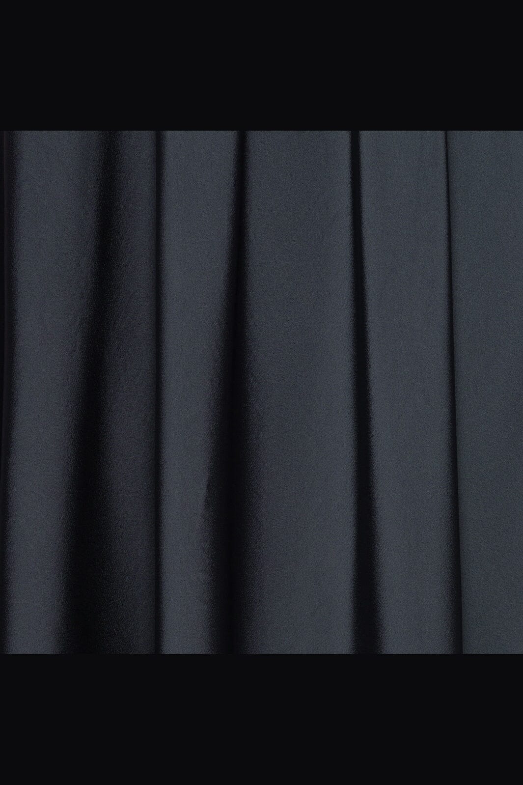 Jupe bleu marine de Karmamia en satin brillant. Elle a une taille haute avec élastique froncé et tombe librement jusqu'aux mollets avec de douces plis.