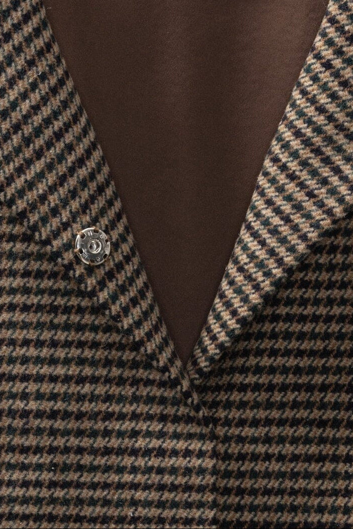 Veste de Karmamia avec un motif à carreaux dans des nuances de brun et de beige. Le tissu extérieur est en laine, tandis que la doublure est en satin de polyester doux.