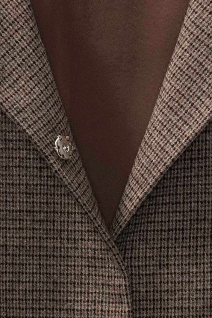 Veste à carreaux de Karmamia dans une nuance de brun. La veste a des manches peplum avec des volants superposés et deux boutons métalliques visibles au niveau de l'encolure.