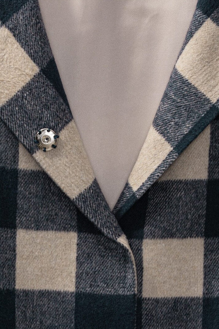 Veste Spencer de Karmamia avec motif à carreaux en beige et bleu marine. La veste a un col en V et des manches 3/4 avec des détails en volants.