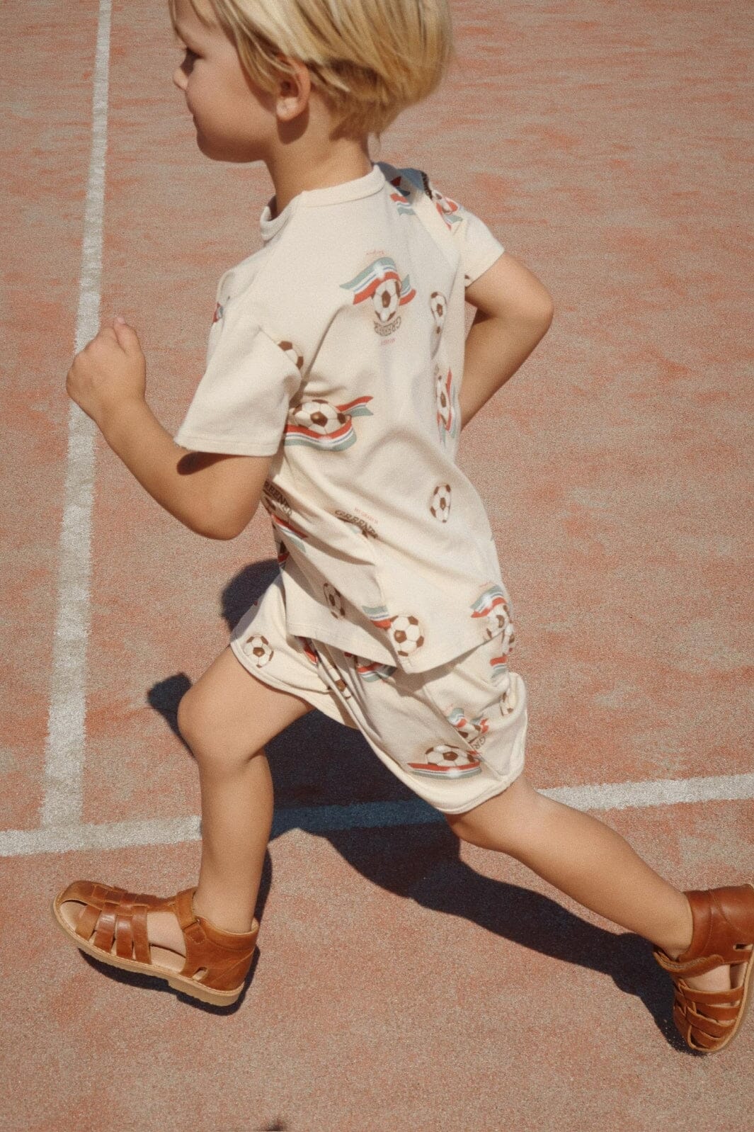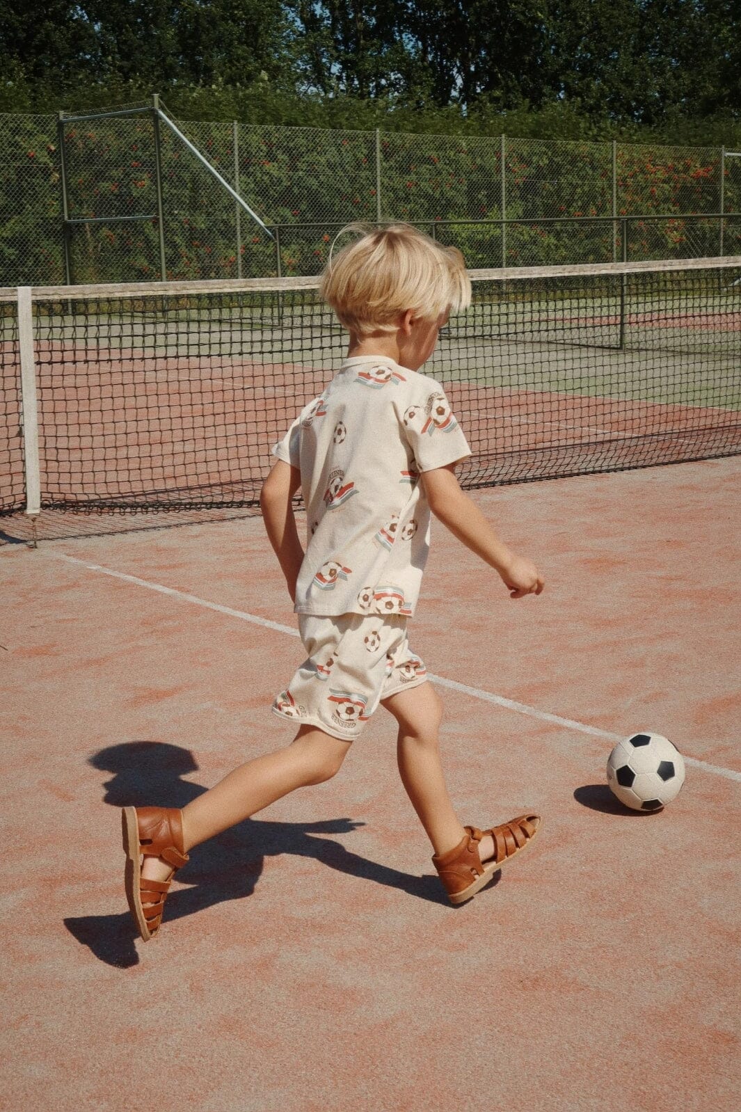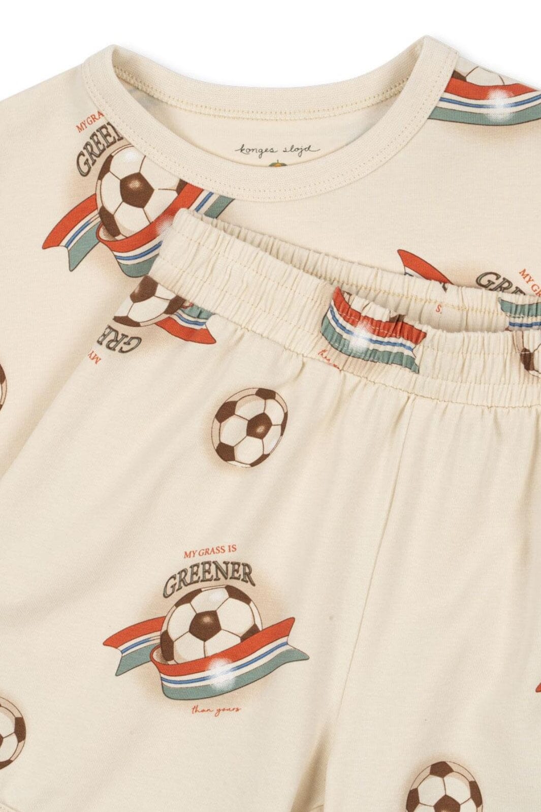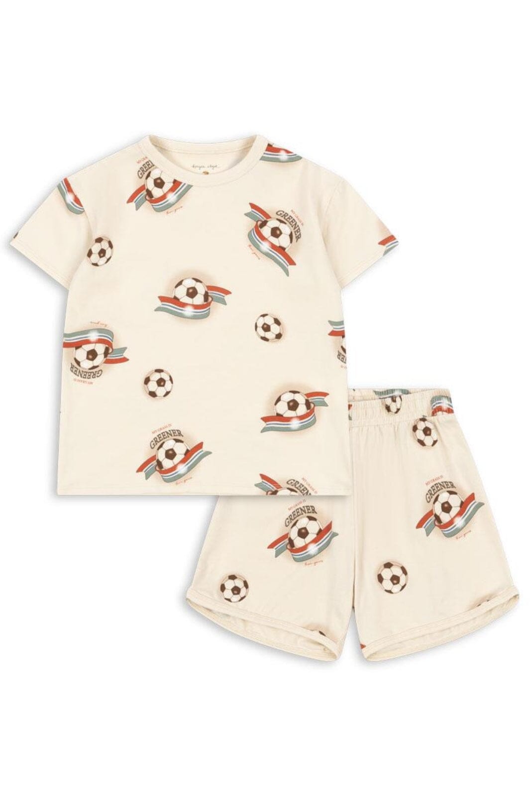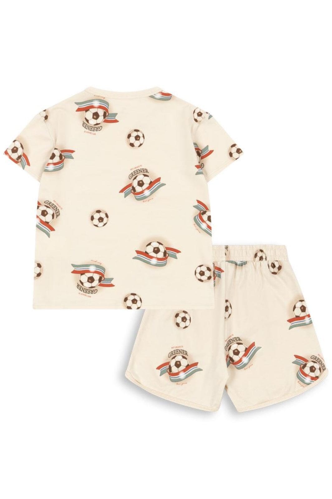 Ensemble certifié GOTS de Konges Sløjd avec T-shirt et shorts sur fond clair. L'ensemble présente un imprimé de football et le texte MY GRASS IS GREENER ainsi que des détails colorés.