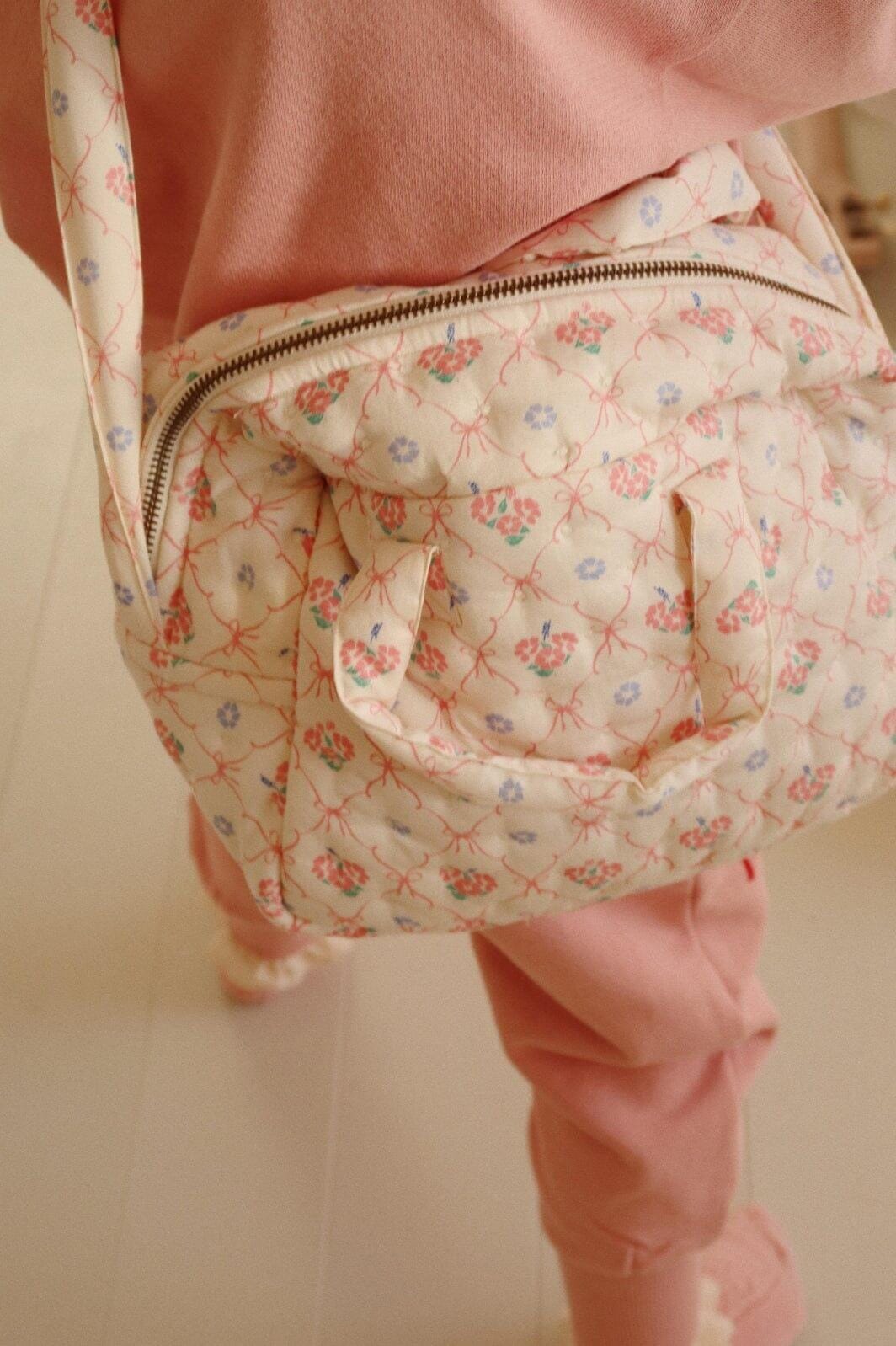 Un sac à poupée de Konges Sløjd avec un motif floral matelassé dans des couleurs claires. Le sac rembourré a une fermeture éclair et est conçu pour le rangement des accessoires de poupée.