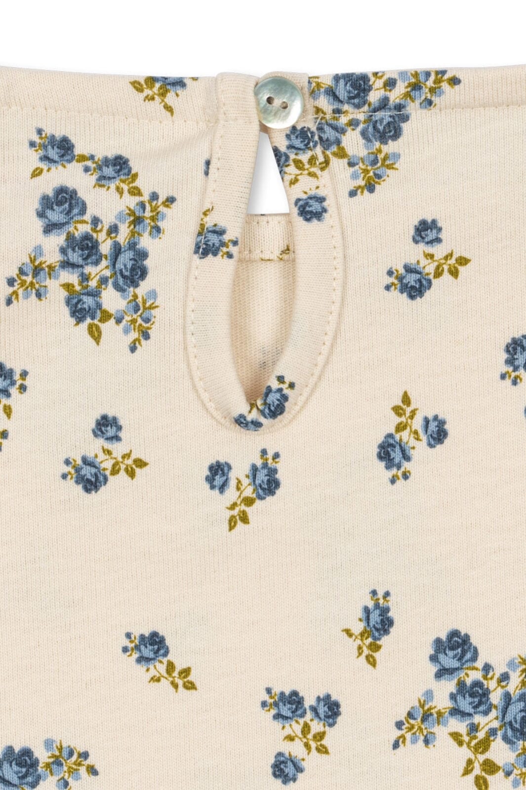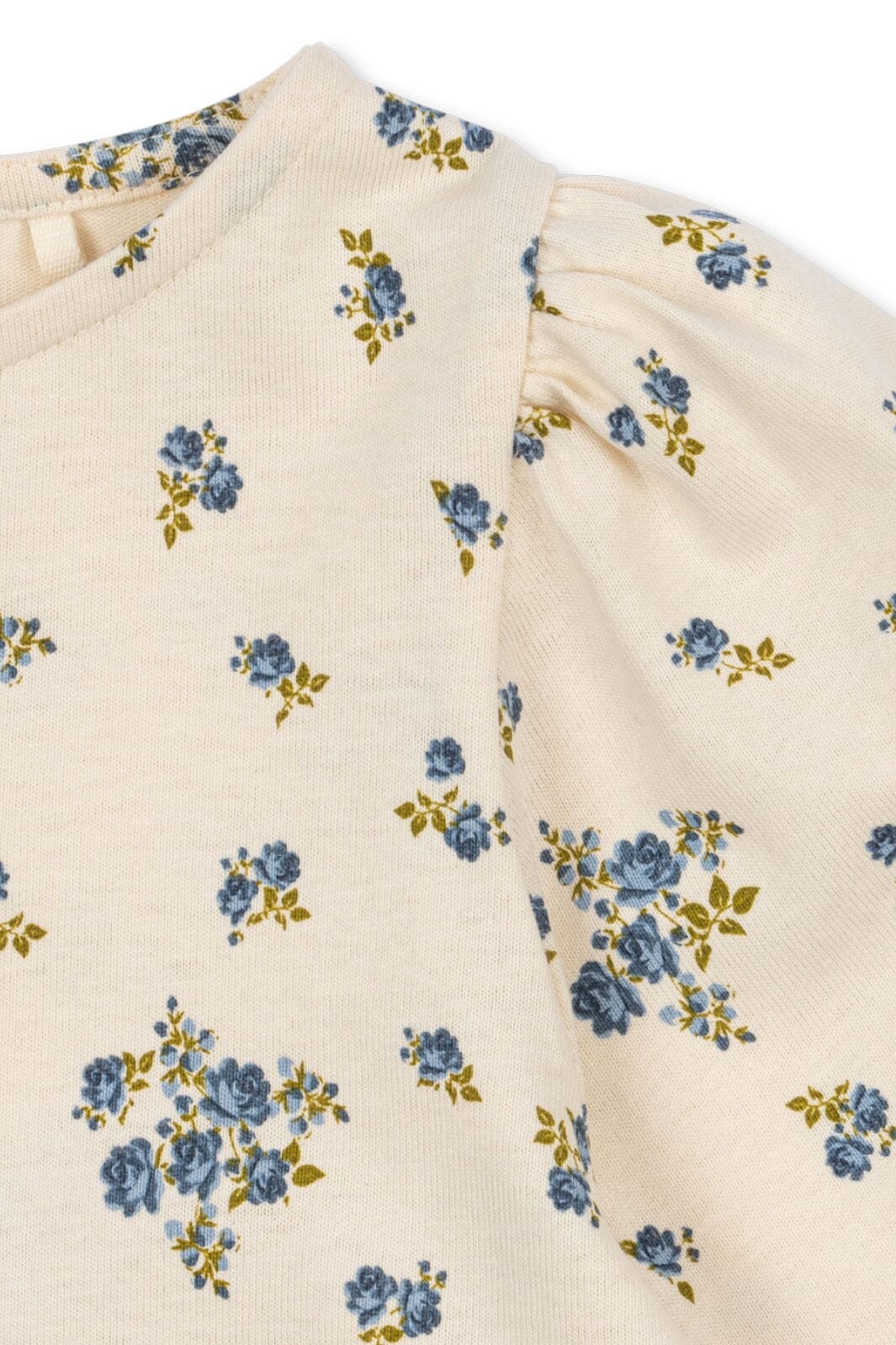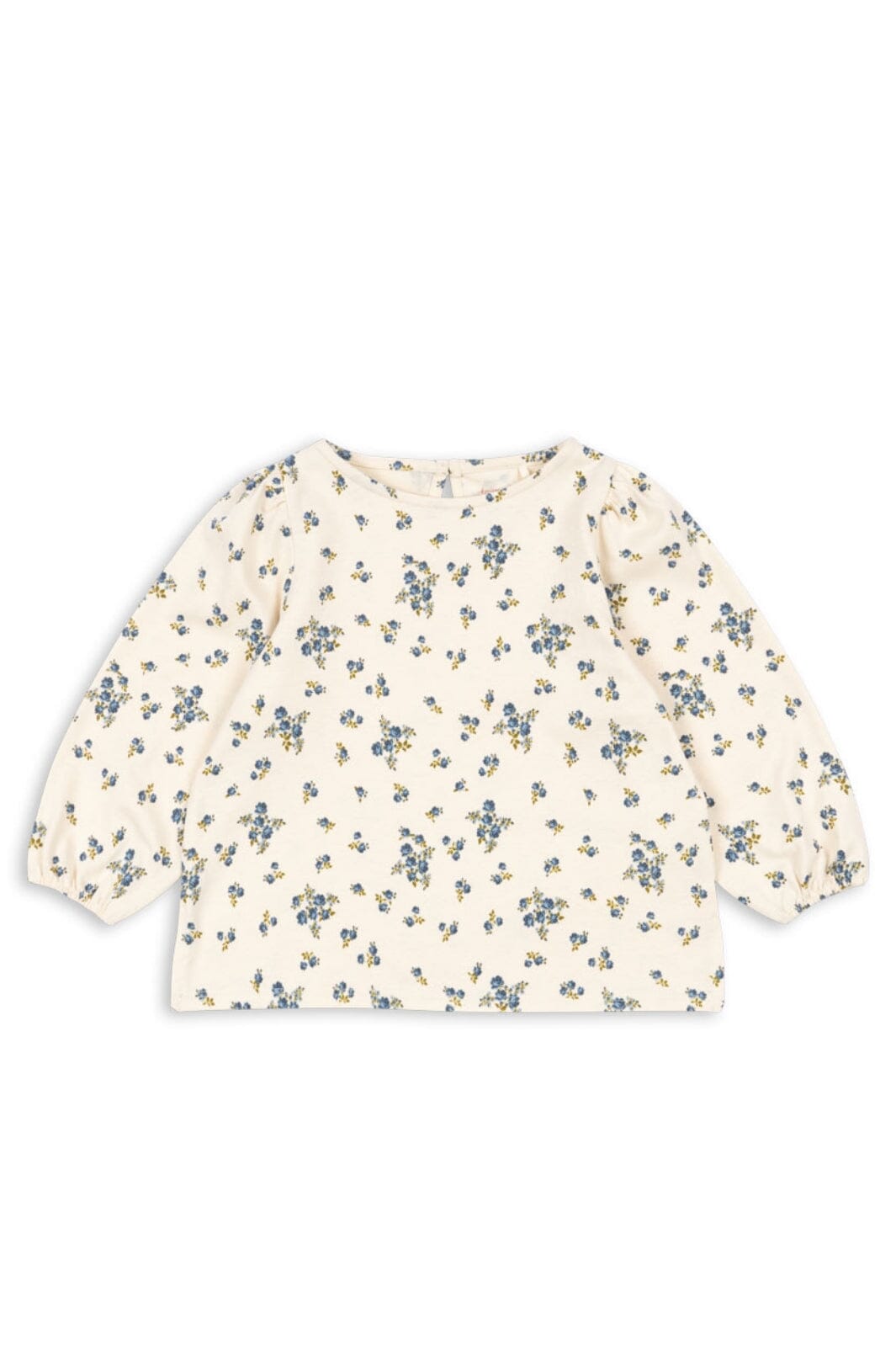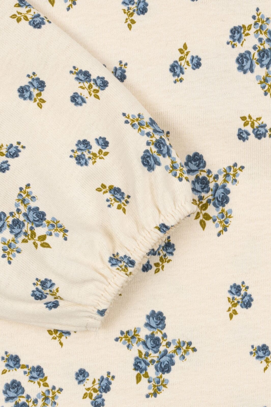 Blouse de Konges Sløjd avec de petites fleurs bleues sur un fond clair. La blouse a des manches longues et une encolure ronde.