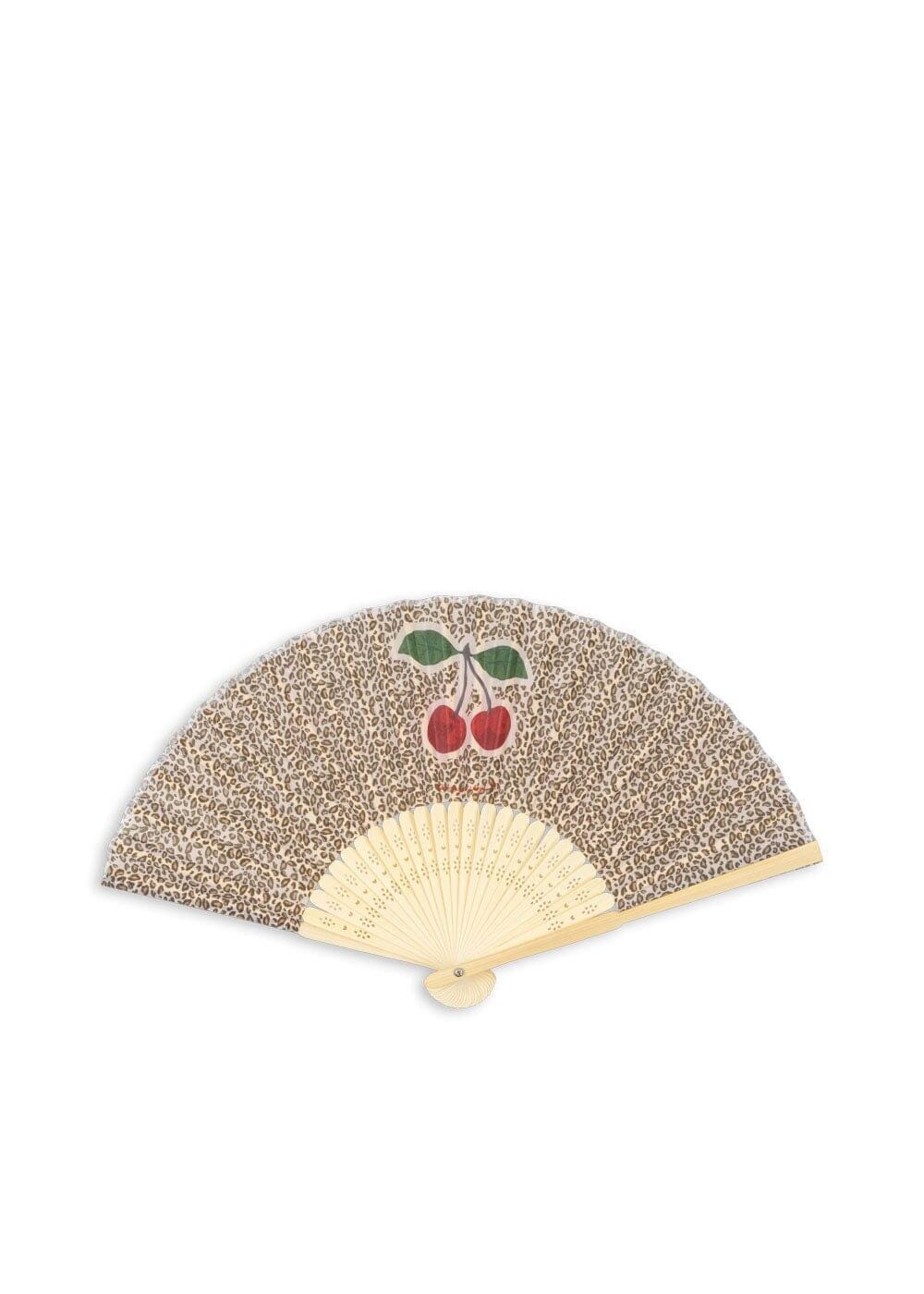 Éventail décoratif de Konges Sløjd avec motif léopard et cerises dans des tons beiges et bruns.