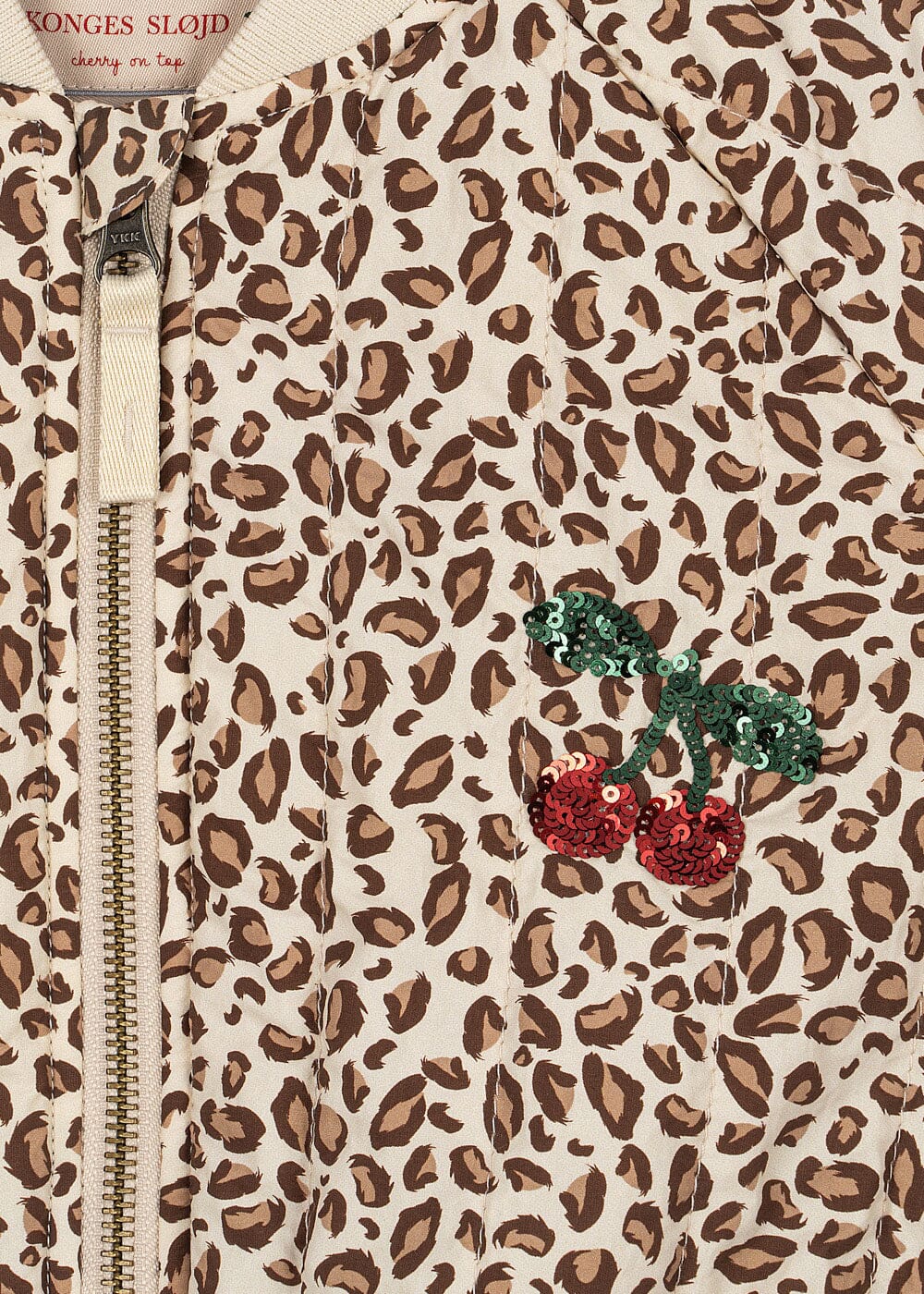 Blouson bomber de Konges Sløjd avec imprimé léopard dans des nuances de beige, brun, vert et rouge sur l’ensemble de la veste.